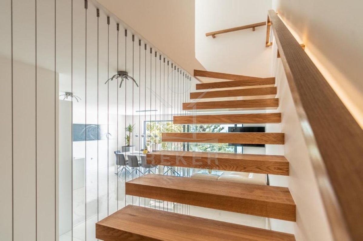 Das Anwesen liegt auf einem Grundstück, das von grünen Bäumen und einer Hanglage umgeben ist. Mit 2 Etagen und einer Wohnfläche von 250 m² bietet das Neubau-Gebäude viel Platz für Komfort und Entspannung. Das Haus ist zudem unterkellert, was zusätzlichen Raum für Lagermöglichkeiten oder einen Fitnessbereich bietet. Genießen Sie die Ruhe und Schönheit der Natur in dieser eleganten Villa.