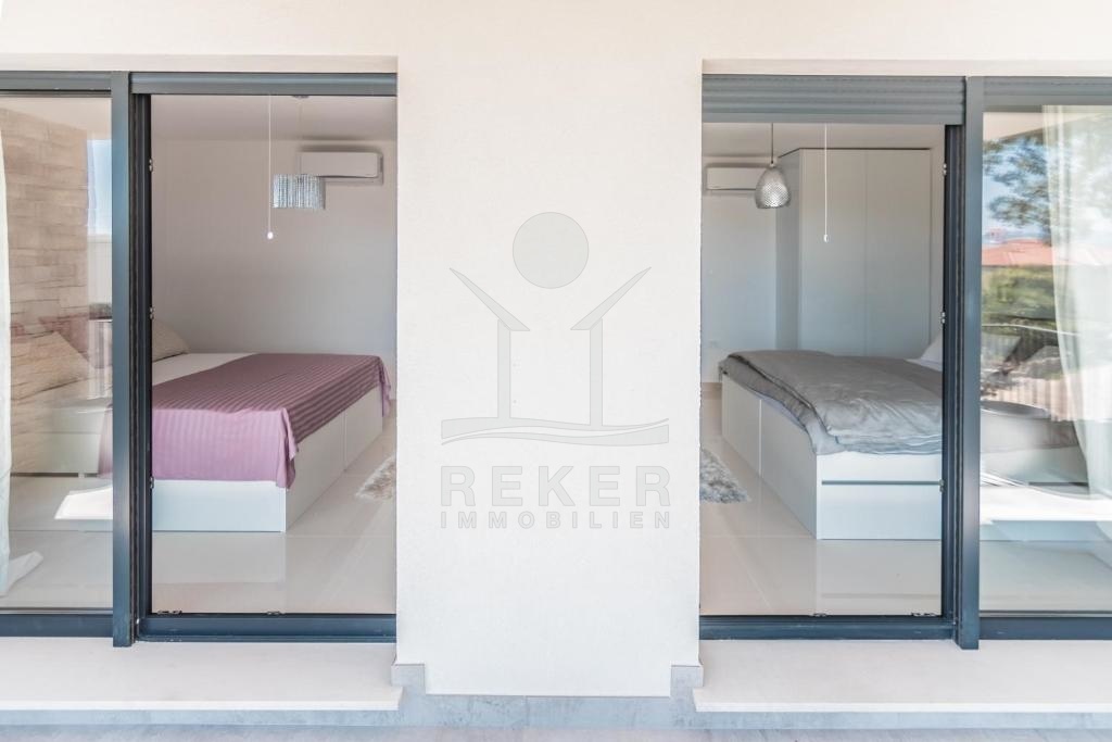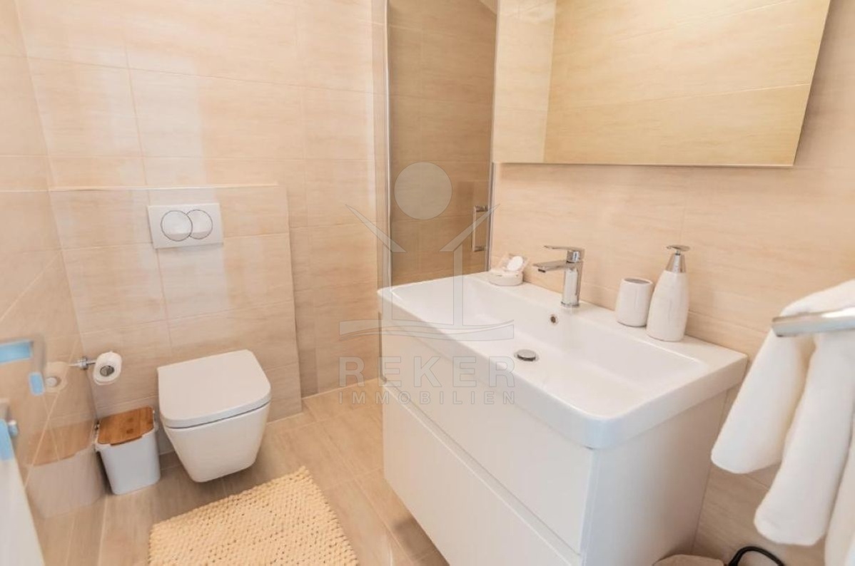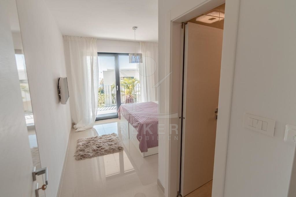 Die Haushälfte überzeugt mit einer hochwertigen Konstruktion und einer stilvollen Ausstattung. Sie ist mit einer Klimaanlage ausgestattet und wird möbliert übergeben. Im Erdgeschoss befinden sich zwei geräumige Schlafzimmer, jeweils mit eigenem Badezimmer, sowie eine überdachte Terrasse. Ideal, um sich zurückzuziehen und Privatsphäre zu genießen.