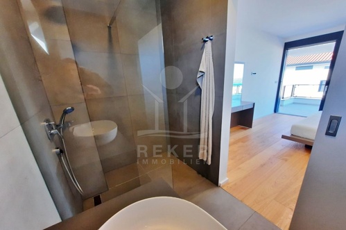 Im ersten Stock finden Sie drei stilvolle Schlafzimmer, die optimalen Rückzugsraum bieten. Dazu kommen zwei moderne Badezimmer, darunter ein privates Bad, das zu einem der Schlafzimmer gehört. Eine weitere überdachte Terrasse lädt zum Verweilen und Entspannen ein, während Sie die Aussicht genießen.
