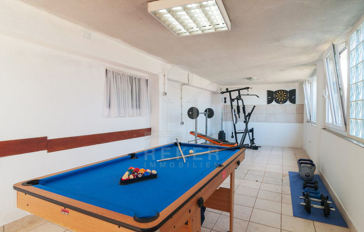 Im Untergeschoss finden Sie eine geräumige Garage (ca. 80 m²) mit einem Lagerraum. Ein weiterer Raum wurde in ein Mini-Fitnesswerkhaus umgewandelt, das als Unterhaltungsraum dient und vielfältige Nutzungsmöglichkeiten bietet.