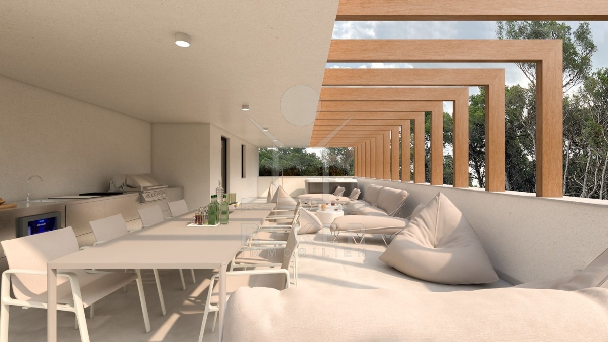 Im Dachgeschoss erwartet Sie eine ausgedehnte Dachterrasse mit 70 m², die teilweise überdacht ist. Hier können Sie entspannen und die bemerkenswerte Architektur genießen. Der überdachte Teil der Terrasse bietet zudem eine Miniküche, die perfekt für Outdoor-Unterhaltung ist.