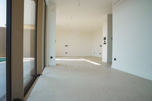 Das Erdgeschoss begeistert mit einem einladenden Eingangsbereich und einem Treppenbereich. Der offene Wohnbereich vereint Ess- und Küchenzimmer und besticht durch große Frontfenster, die viel Tageslicht hereinlassen. Von hier gelangen Sie direkt auf die zugängliche Terrasse und zum Poolbereich. Der großzügige Terrassenbereich von 55 m² lädt zum Entspannen und Verweilen ein und beherbergt einen einladenden Pool von 8 m², ideal für erfrischende Stunden an warmen Tagen. Eine Außendusche sorgt für zusätzlichen Komfort und rundet das Wellness-Erlebnis ab.