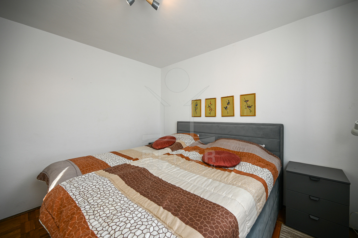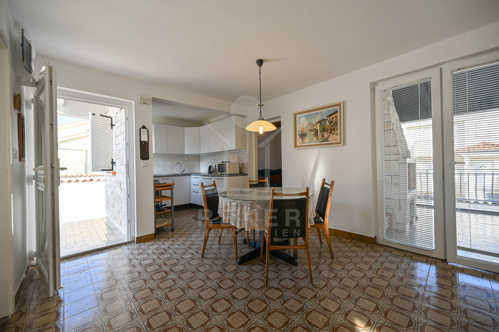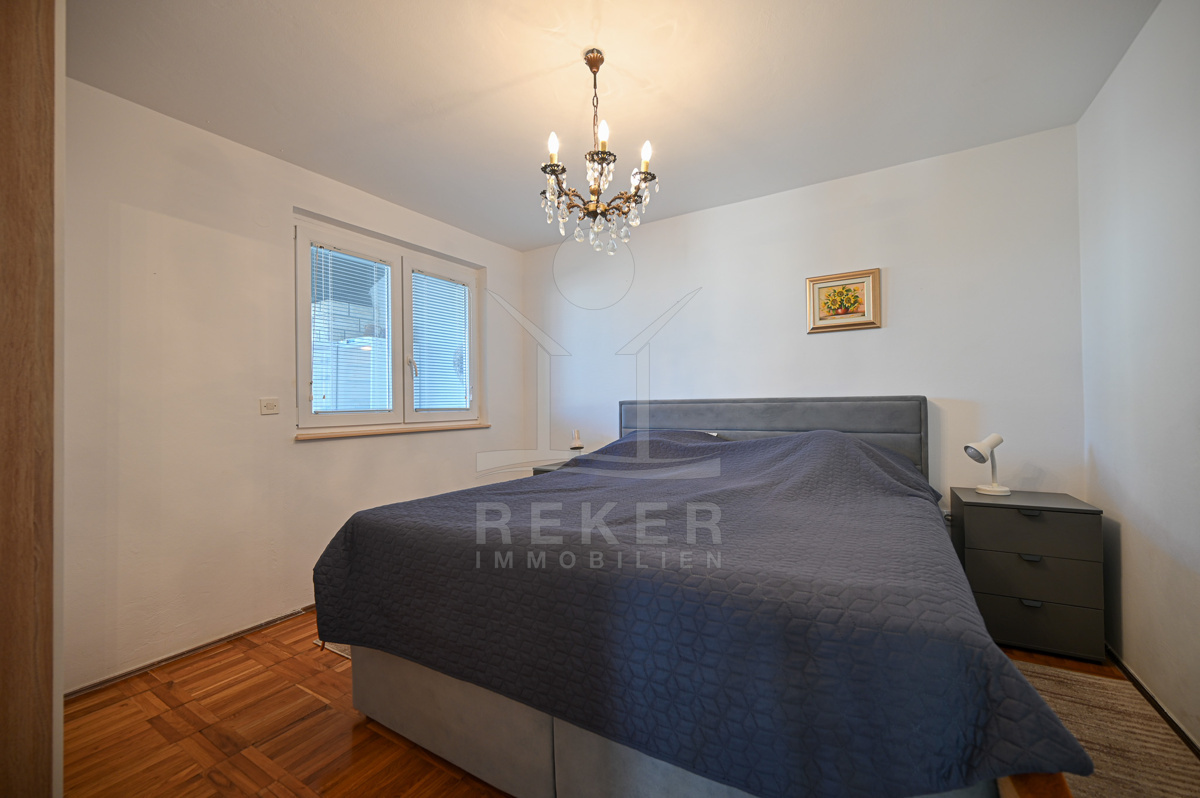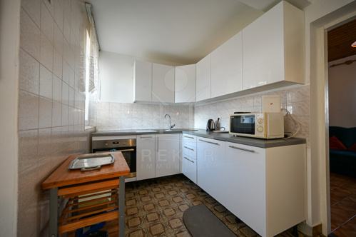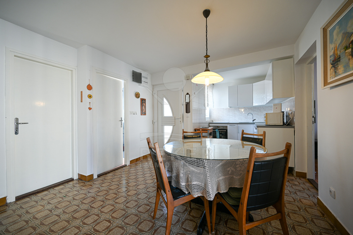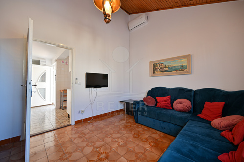 Im Inneren warten rund 125 m² Wohnfläche, aufgeteilt in zwei Einheiten. Das Erdgeschoss beherbergt eine helle Dreizimmerwohnung, im Untergeschoss befindet sich ein separates Studio mit Schlafzimmer. Praktisch, wenn Familie oder Gäste kommen. Insgesamt gibt es vier Schlafzimmer, die ausreichend Raum bieten. Durch die Nordwest-Ausrichtung wirken die Räume hell und angenehm. Eine Einbauküche, Fernseher und Bett sind vorhanden. Kamin, Heizung und Klimaanlage sorgen das ganze Jahr über für Komfort. Dazu kommen Keller und Abstellraum. Das Haus wurde renoviert und ist sofort bewohnbar. Es verbindet Komfort, Funktionalität und Meeresnähe.