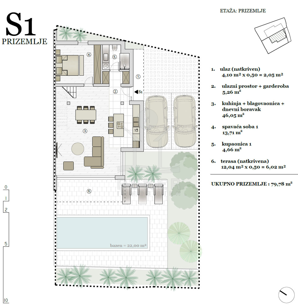Der Gartenbereich ist privat, pflegeleicht und gut durchdacht: viel Platz für Sonnenliegen, dazu ein 22 m² großer Pool, ganz für Sie allein. Direkt daneben eine überdachte Terrasse für Frühstück, Schattenpause oder ein Abendessen im Freien. Alles, was Sie im Sommer draußen brauchen, ist da. Und oben drauf: zwei weitere Balkone im Obergeschoss plus die große Dachterrasse mit fast 70 m² Fläche. Ob Lounge, Whirlpool oder Grillplatz … hier oben ist alles möglich. Mit dieser Aussicht fällt selbst das Nichtstun leicht.