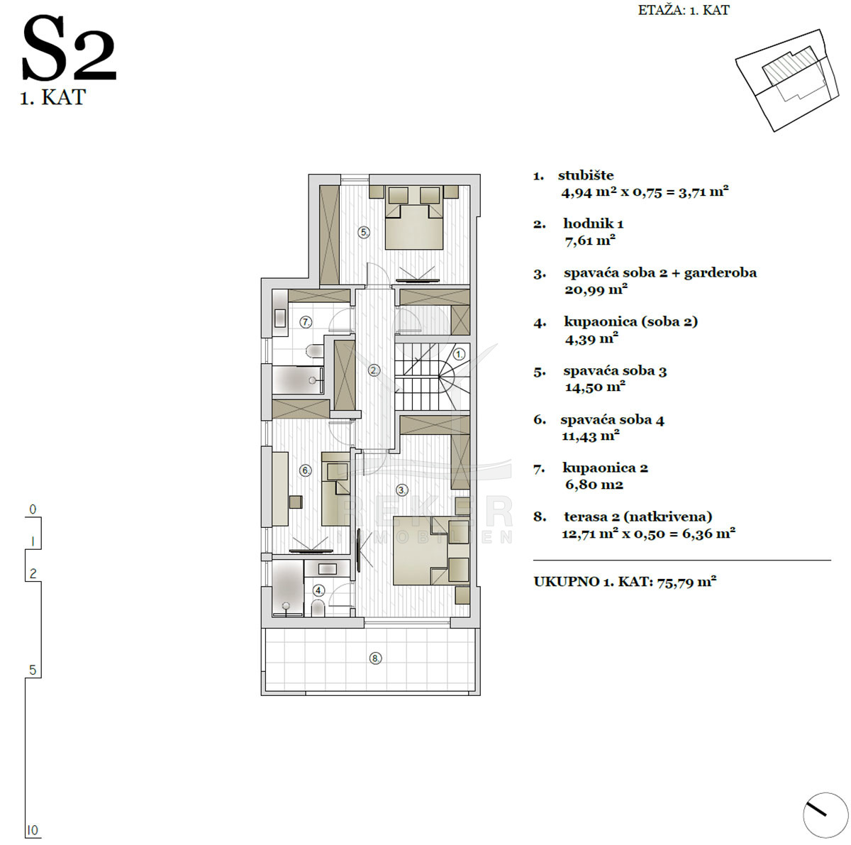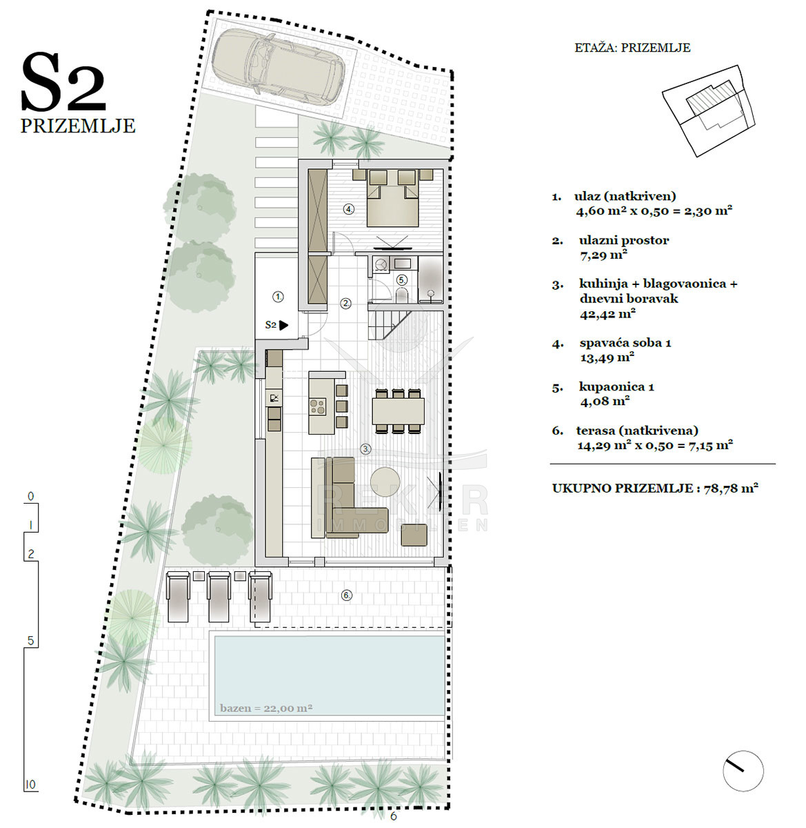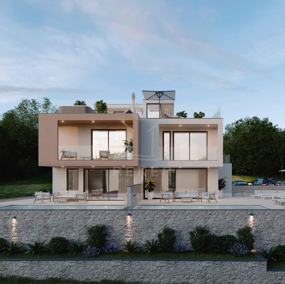 Etwas oberhalb von Vodice, dort wo die Straßen ruhiger werden und der Blick freier, liegt diese moderne Doppelhaushälfte mit großzügigen 224 m² Nutzfläche auf drei Ebenen. Das Grundstück ist eigenständig, der Garten gepflegt, der Parkplatz direkt neben dem Haus. Vom Balkon und besonders von der Dachterrasse aus schweift der Blick über Dächer, grüne Hügel … bis hinaus auf die Inselwelt vor der Küste.