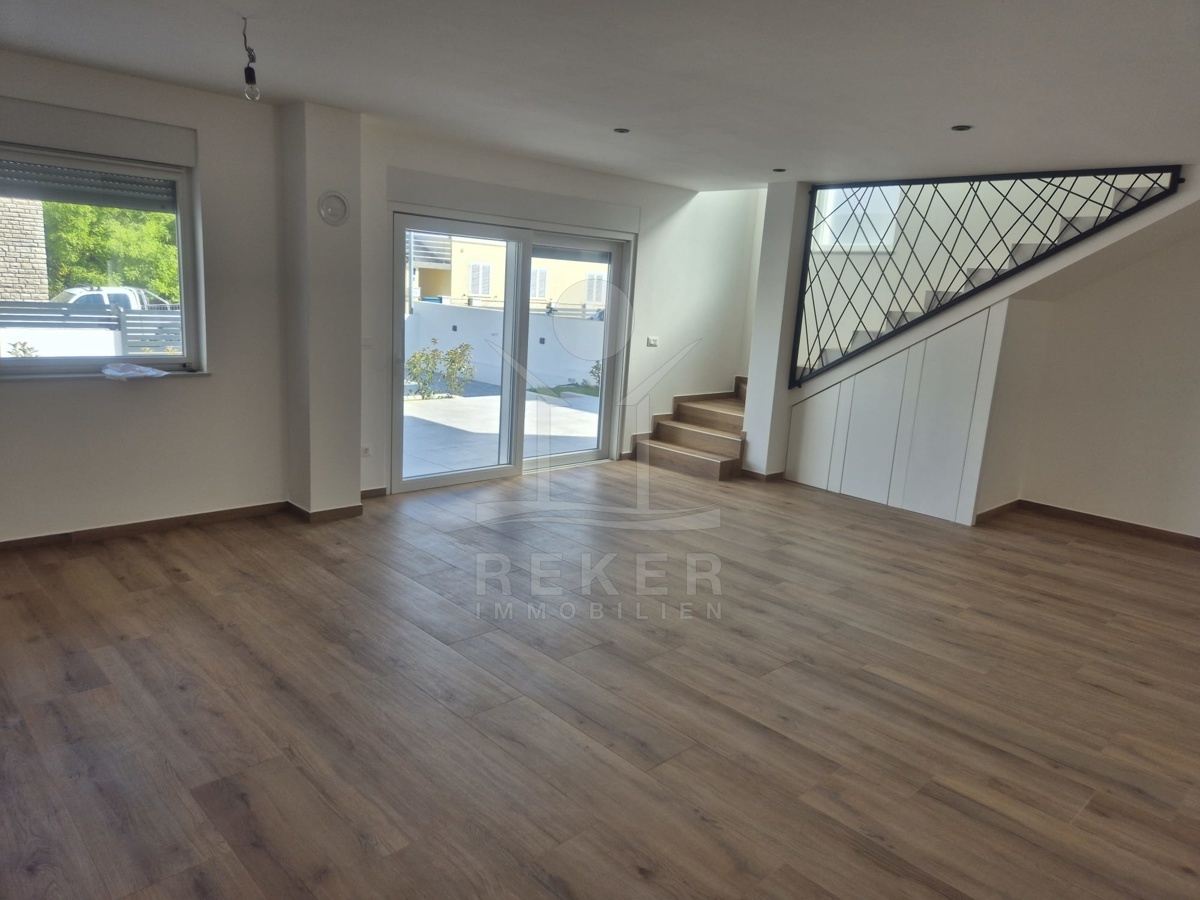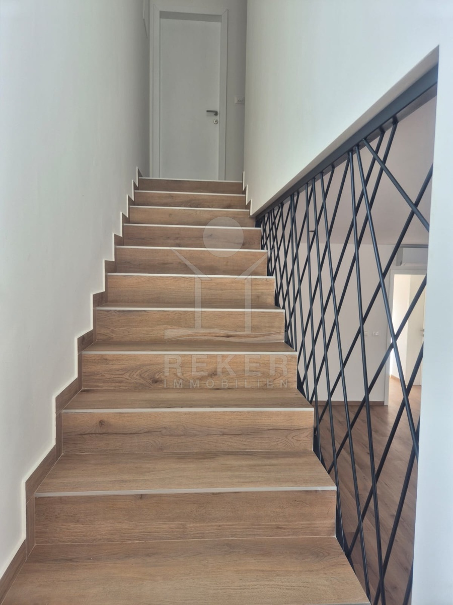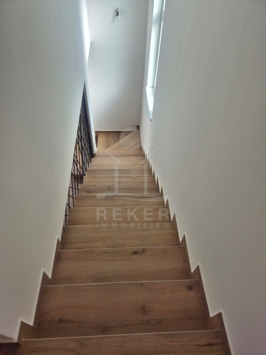 Im Inneren wartet zeitgemäßer Wohnkomfort auf Sie. Das Erdgeschoss ist offen gestaltet mit einem großzügigen Wohn-, Ess- und Kochbereich. Der Zugang zur Terrasse öffnet den Raum ins Freie. Die moderne Innentreppe verbindet beide Etagen. Oben liegen drei Schlafzimmer. Das Master-Zimmer hat ein eigenes Bad und einen Balkon. Perfekt, wenn jeder seinen Rückzugsort braucht. Zwei weitere Zimmer, ein zusätzliches Bad und eine separate Waschküche machen das Haus komplett. Fußbodenheizung und Klimaanlage sind eingebaut. Die Südwest-Ausrichtung sorgt für viel Tageslicht.