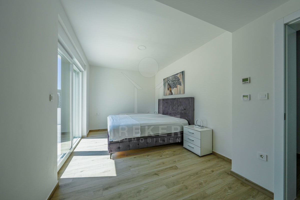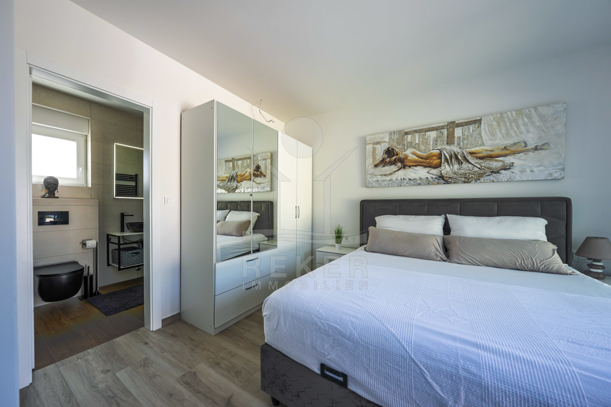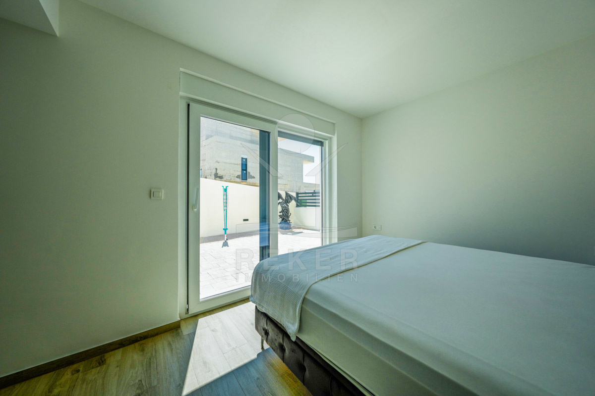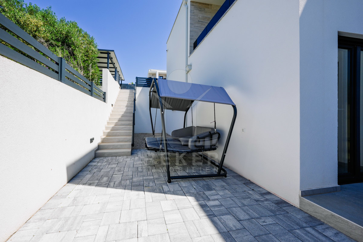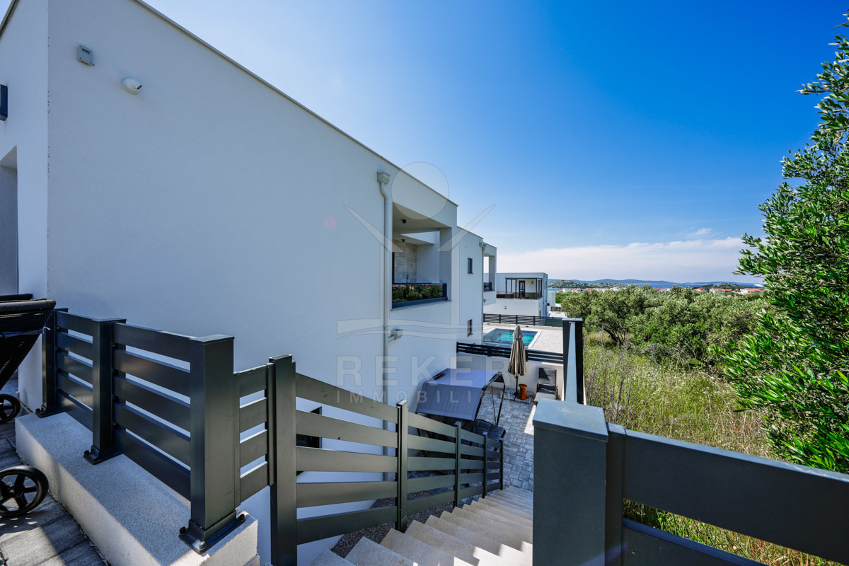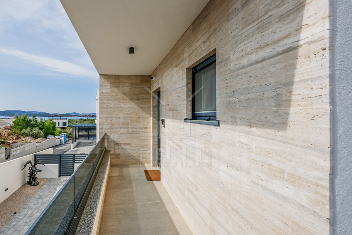 Vodice ganz ruhig: Das Haus liegt am Ende einer kleinen Sackgasse. Umgeben von viel Grün und gepflegten Neubauten. Hier gibt’s keinen Durchgangsverkehr – dafür Privatsphäre und Gelassenheit. Nur 800 Meter bis zum Meer, zu Fuß machbar. Und obendrauf: echter Meerblick vom Obergeschoss. Die Nachbarschaft? Wertig, modern, locker bebaut. Ideal für alle, die Ruhe wollen – aber kein Niemandsland.
