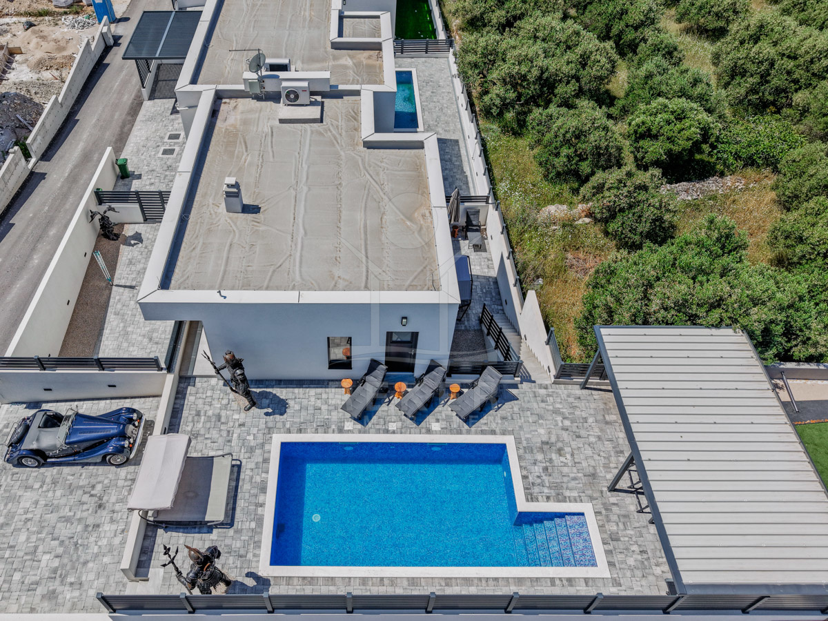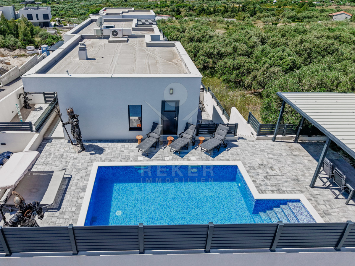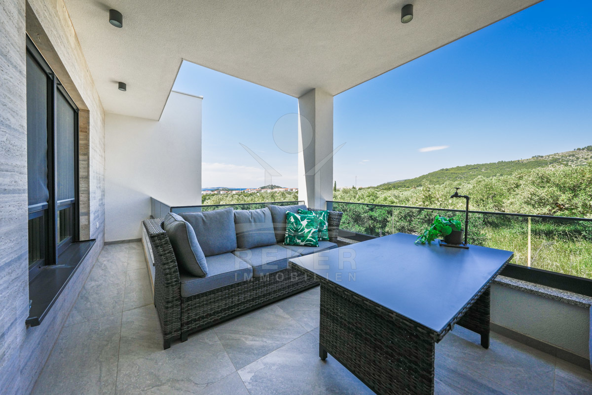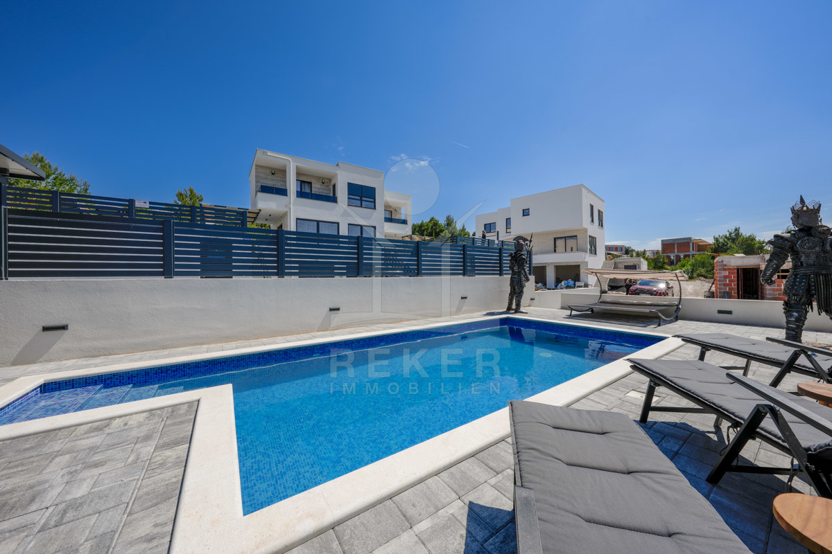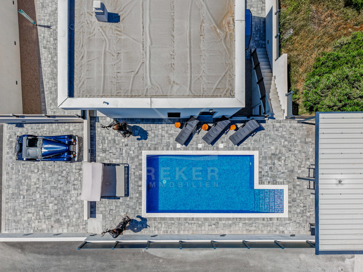 Vodice ganz ruhig: Das Haus liegt am Ende einer kleinen Sackgasse. Umgeben von viel Grün und gepflegten Neubauten. Hier gibt’s keinen Durchgangsverkehr – dafür Privatsphäre und Gelassenheit. Nur 800 Meter bis zum Meer, zu Fuß machbar. Und obendrauf: echter Meerblick vom Obergeschoss. Die Nachbarschaft? Wertig, modern, locker bebaut. Ideal für alle, die Ruhe wollen – aber kein Niemandsland.