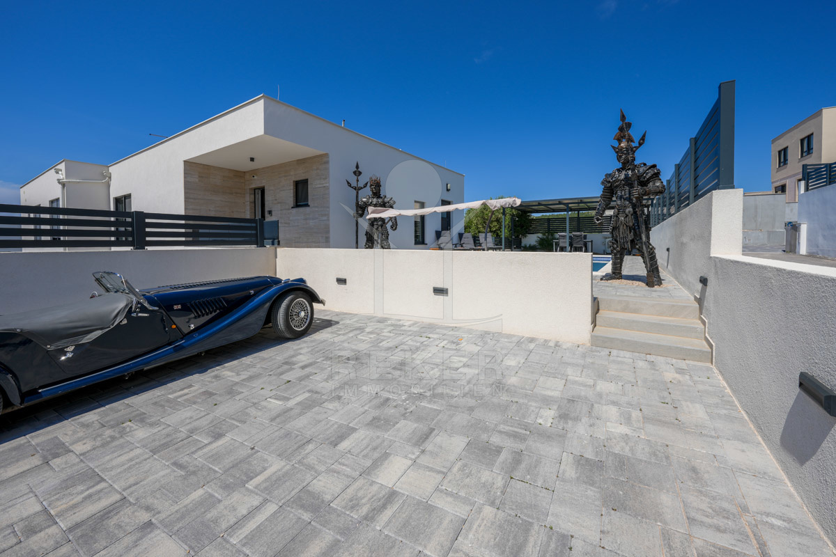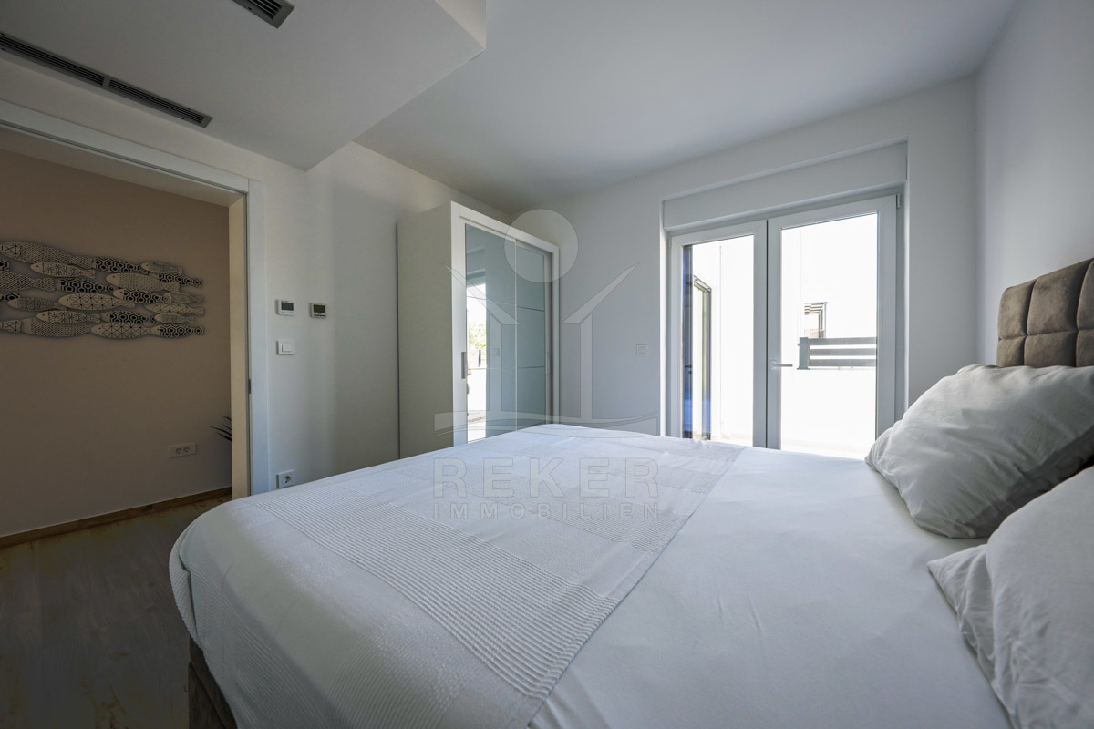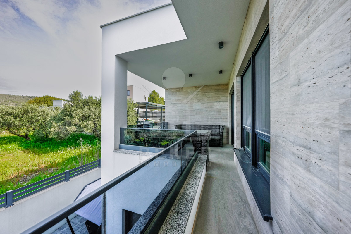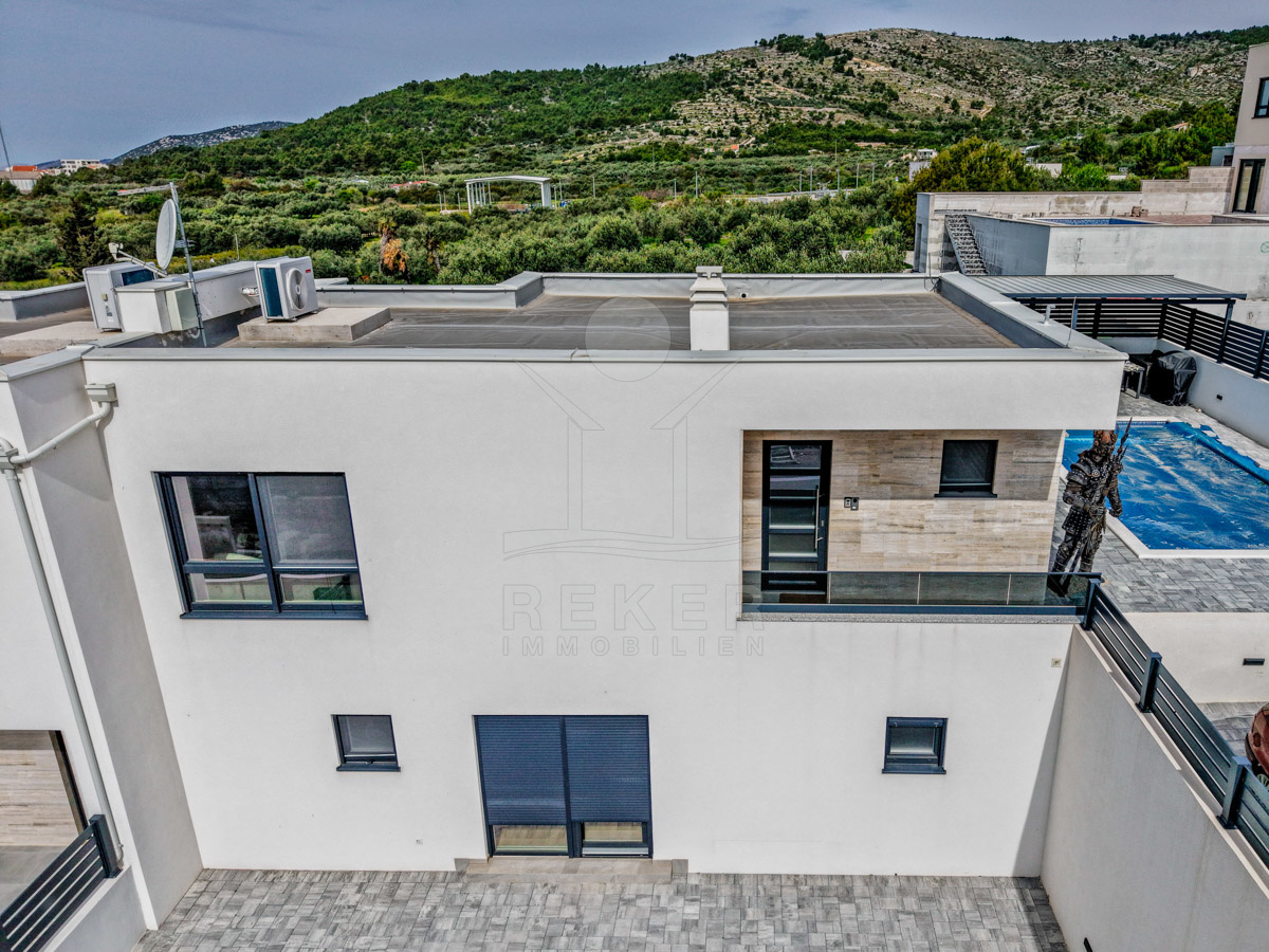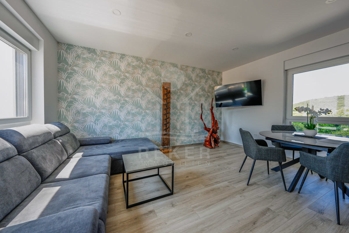Vodice ganz ruhig: Das Haus liegt am Ende einer kleinen Sackgasse. Umgeben von viel Grün und gepflegten Neubauten. Hier gibt’s keinen Durchgangsverkehr – dafür Privatsphäre und Gelassenheit. Nur 800 Meter bis zum Meer, zu Fuß machbar. Und obendrauf: echter Meerblick vom Obergeschoss. Die Nachbarschaft? Wertig, modern, locker bebaut. Ideal für alle, die Ruhe wollen – aber kein Niemandsland.
