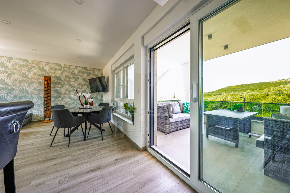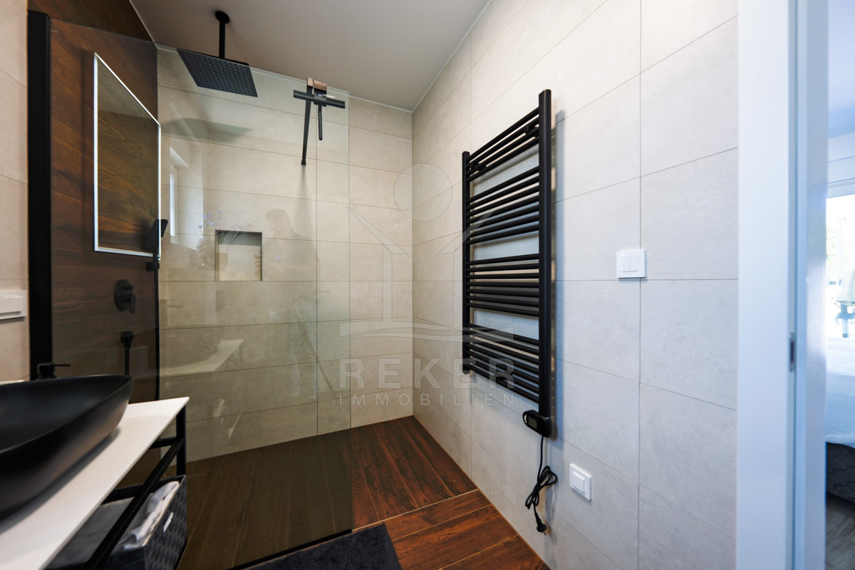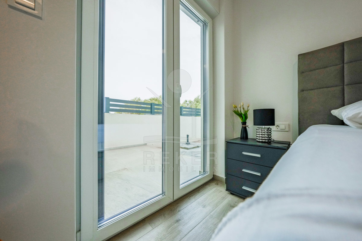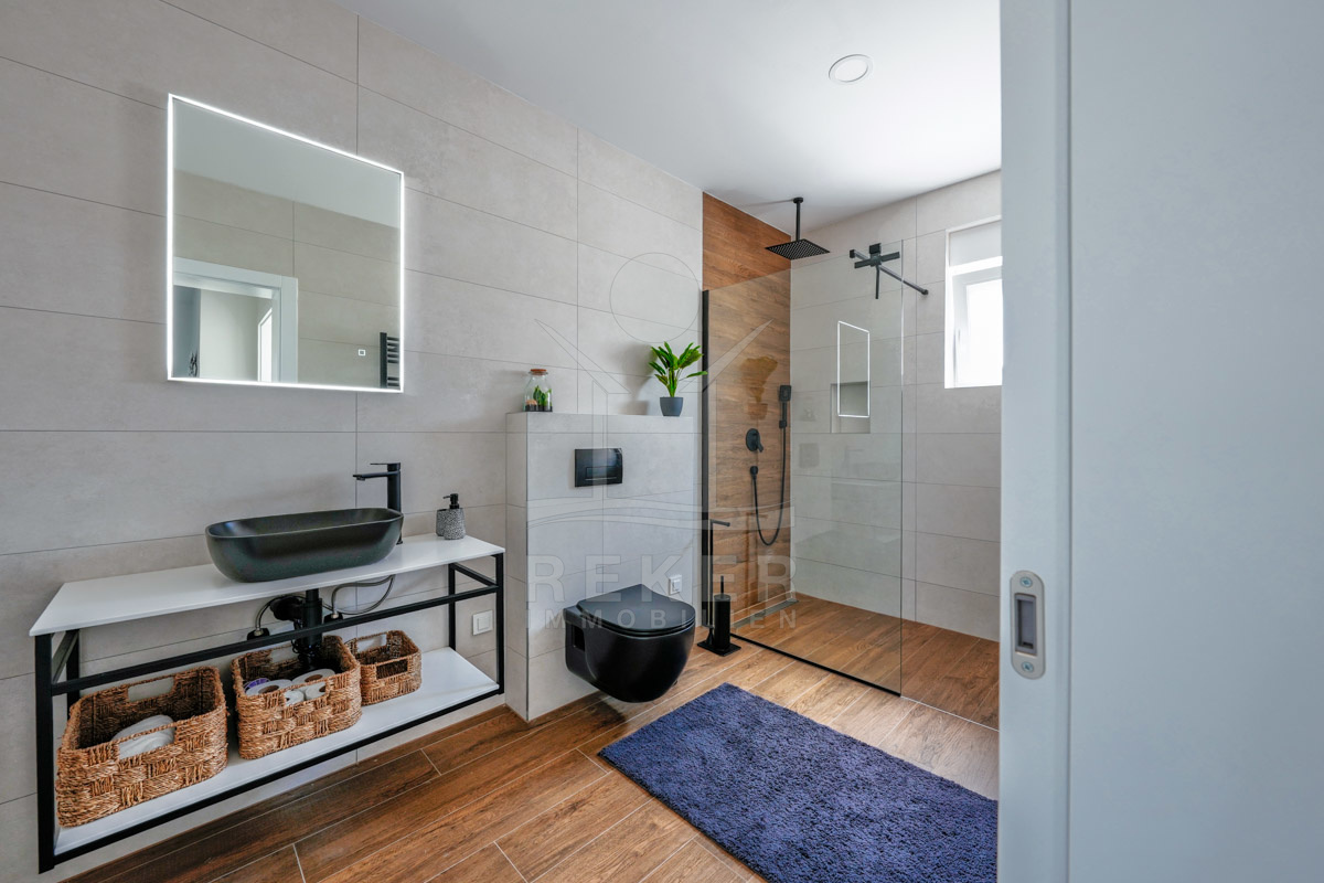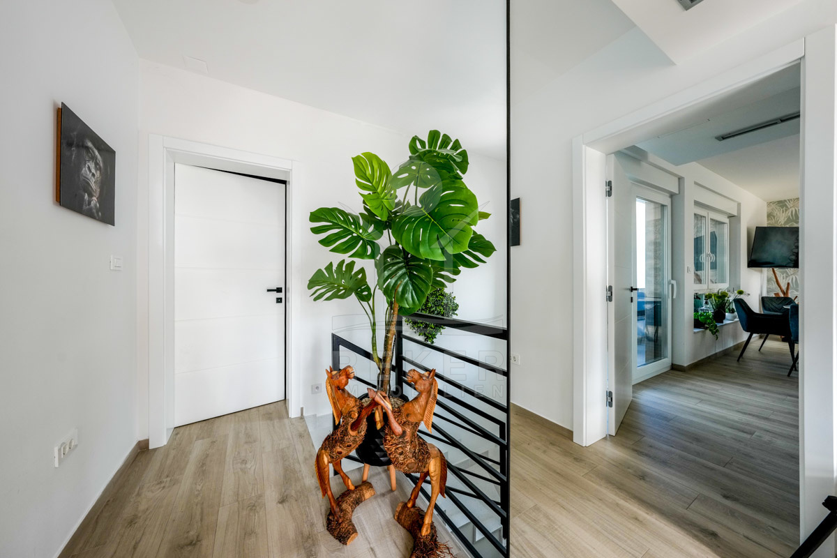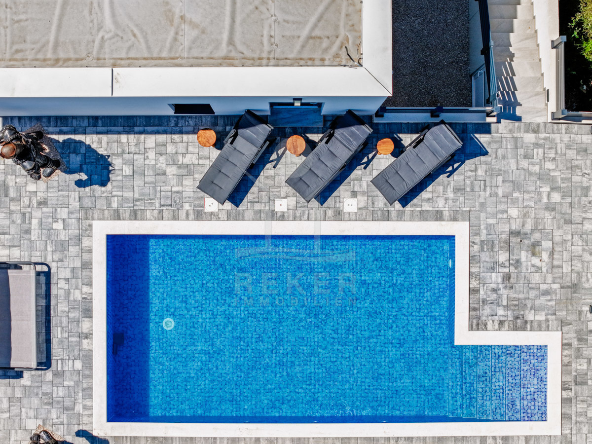 Vodice ganz ruhig: Das Haus liegt am Ende einer kleinen Sackgasse. Umgeben von viel Grün und gepflegten Neubauten. Hier gibt’s keinen Durchgangsverkehr – dafür Privatsphäre und Gelassenheit. Nur 800 Meter bis zum Meer, zu Fuß machbar. Und obendrauf: echter Meerblick vom Obergeschoss. Die Nachbarschaft? Wertig, modern, locker bebaut. Ideal für alle, die Ruhe wollen – aber kein Niemandsland.