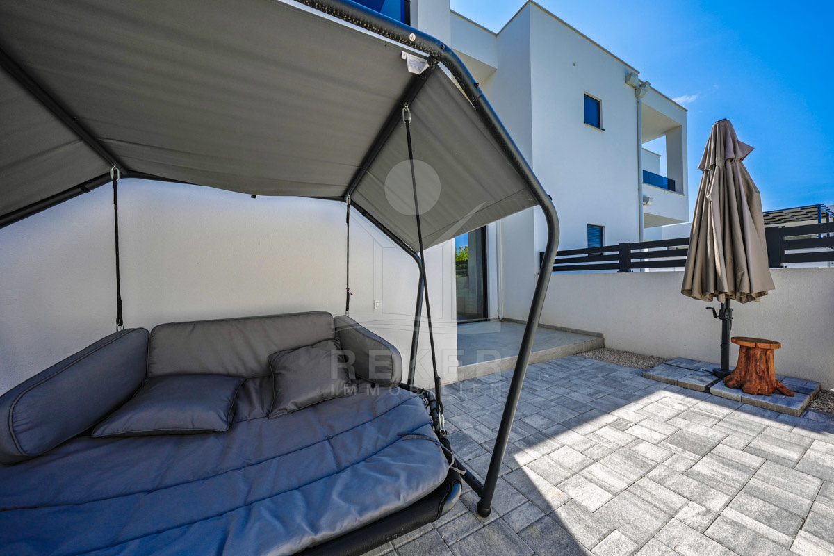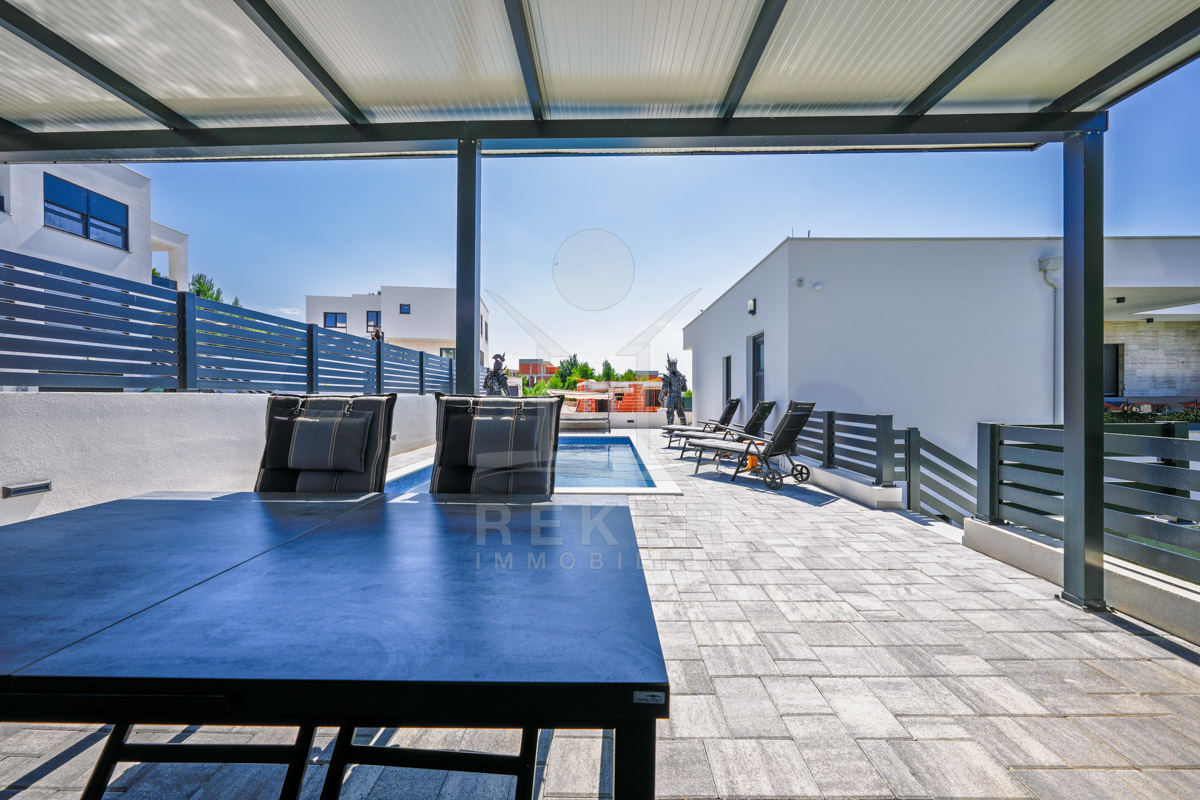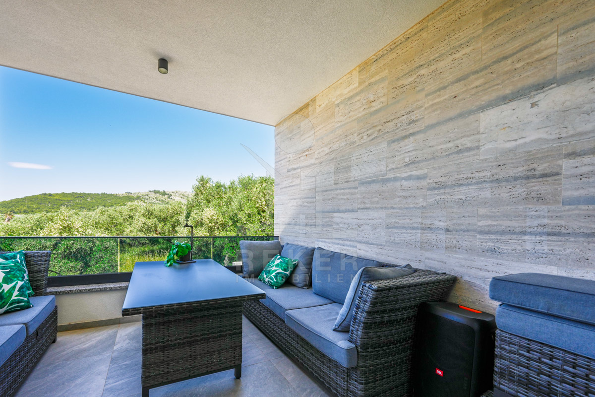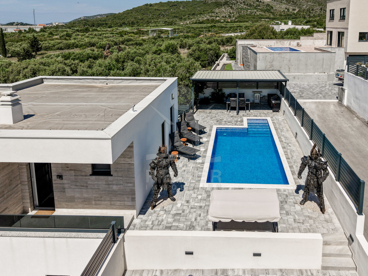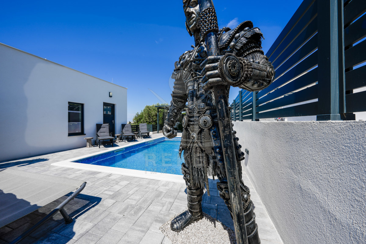 Vodice ganz ruhig: Das Haus liegt am Ende einer kleinen Sackgasse. Umgeben von viel Grün und gepflegten Neubauten. Hier gibt’s keinen Durchgangsverkehr – dafür Privatsphäre und Gelassenheit. Nur 800 Meter bis zum Meer, zu Fuß machbar. Und obendrauf: echter Meerblick vom Obergeschoss. Die Nachbarschaft? Wertig, modern, locker bebaut. Ideal für alle, die Ruhe wollen – aber kein Niemandsland.