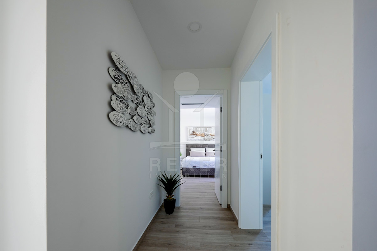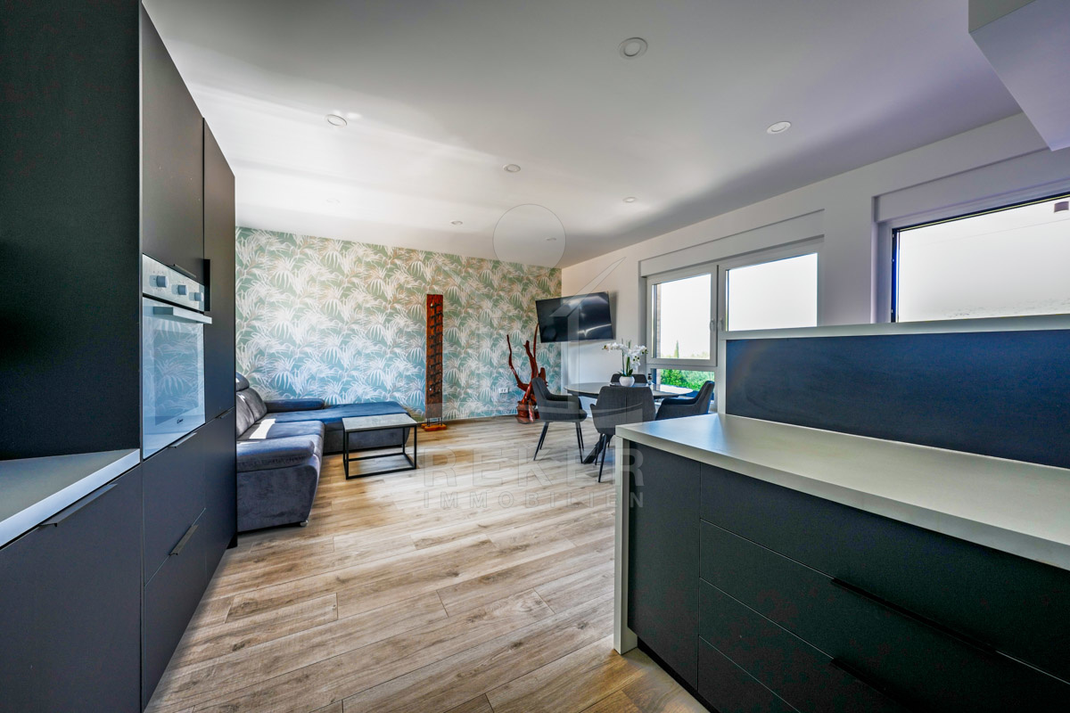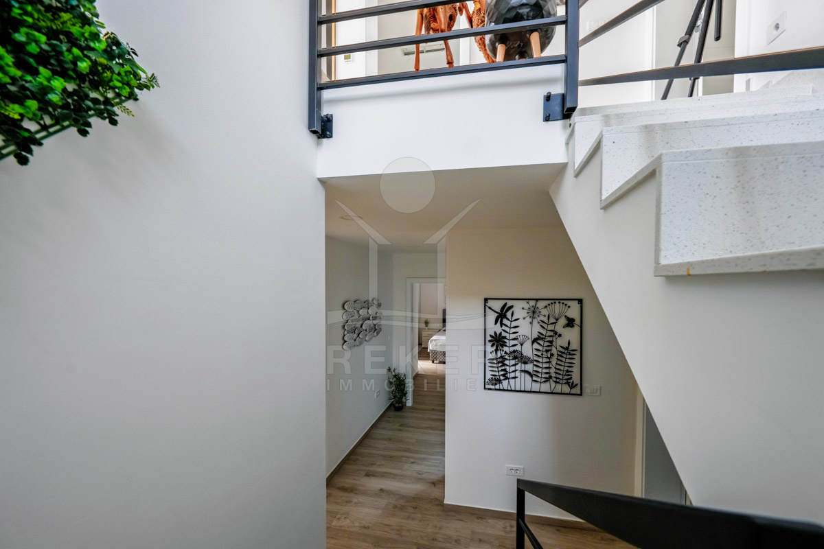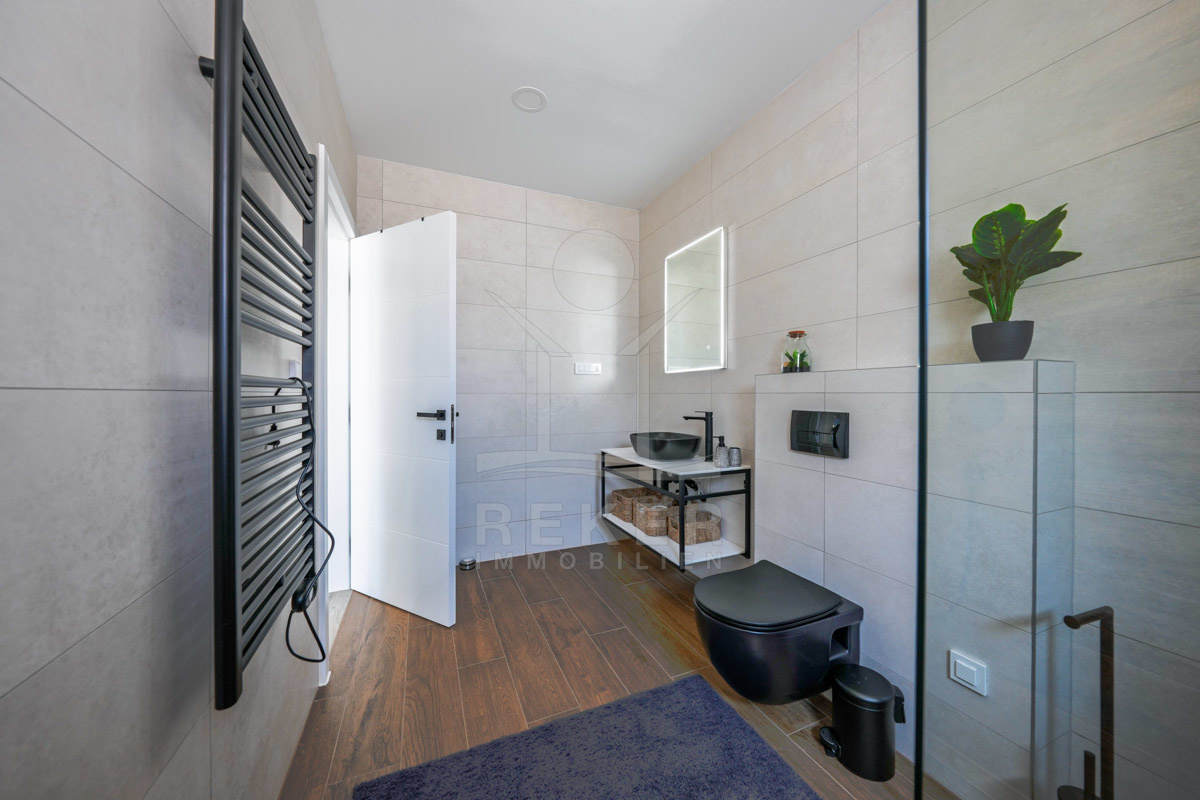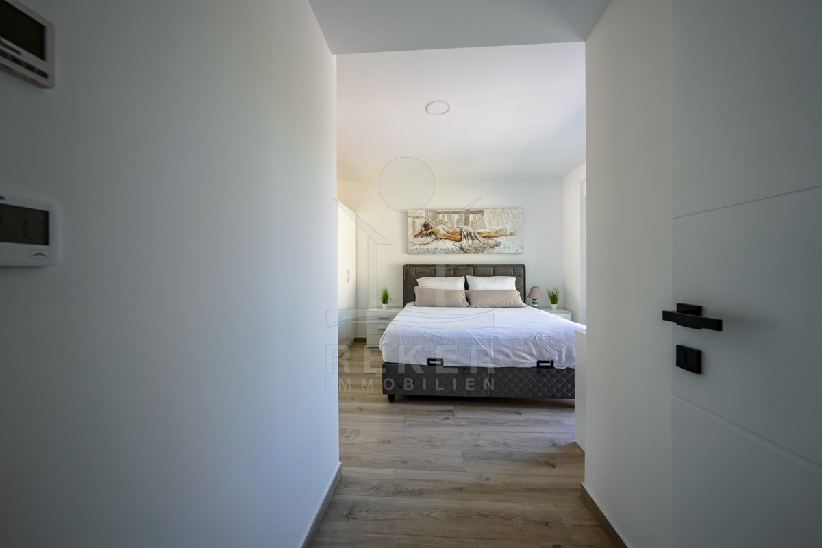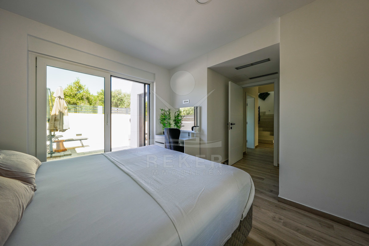Drinnen überzeugt die Raumaufteilung sofort. Drei Schlafzimmer, drei Badezimmer, durchdacht auf zwei Etagen verteilt. Besonders angenehm: Jedes Schlafzimmer hat einen eigenen Terrassenzugang – das fühlt sich großzügig an und bringt viel Licht und Luft in jeden Raum. Eines der Schlafzimmer verfügt über ein eigenes Bad – ideal für Gäste oder Eltern, die Privatsphäre schätzen. Der zentrale Wohn-, Ess- und Küchenbereich im Obergeschoss misst über 31 m². Offen, lichtdurchflutet, stilvoll möbliert. Der Blick nach draußen: Richtung Natur, Richtung Meer. Von beiden Etagen aus lässt sich der Pool direkt erreichen – praktisch für Familien und einfach bequem im Alltag.
