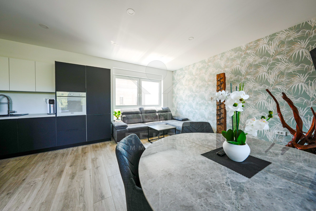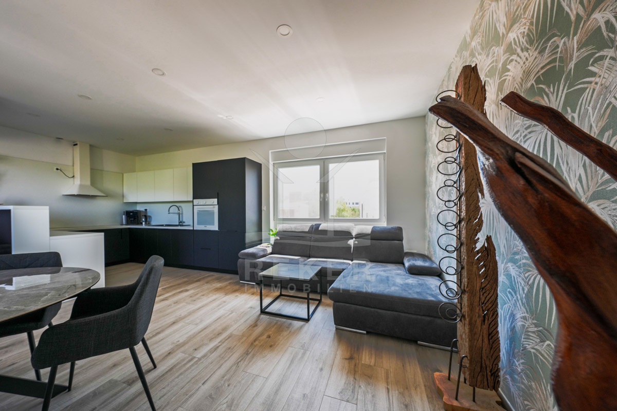 Der Außenbereich ist ein echtes Argument. 215 m² privater Garten. Viel Platz zum Spielen, Entspannen oder Grillen. Dazu ein moderner Salzwasserpool – angenehmer für Haut und Pflege. Zwei Parkplätze direkt vor dem Haus. Und als Highlight für alle, die Kunst lieben: ausdrucksstarke Skulpturen, die dem Garten Charakter geben. Das Ganze wirkt durchdacht, nicht überladen – einfach stilvoll anders.