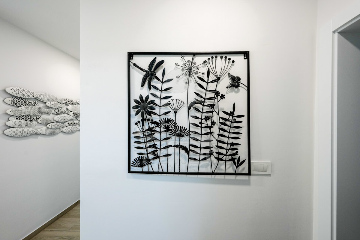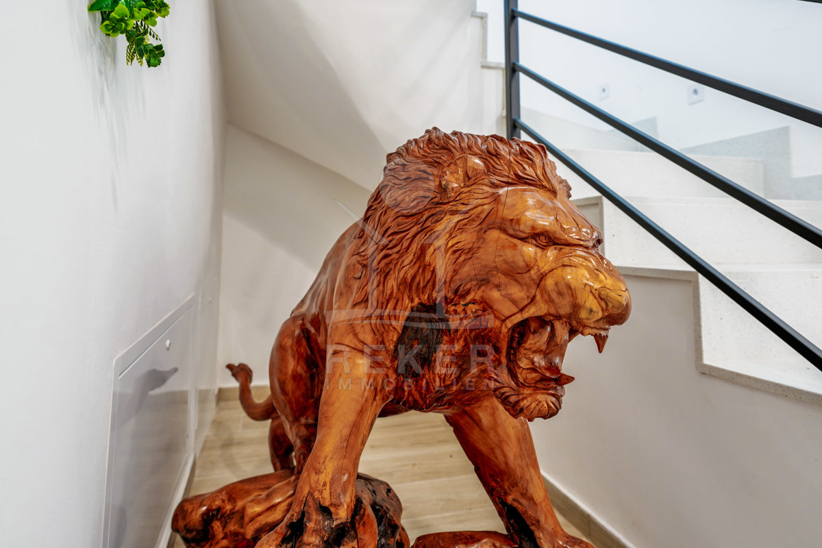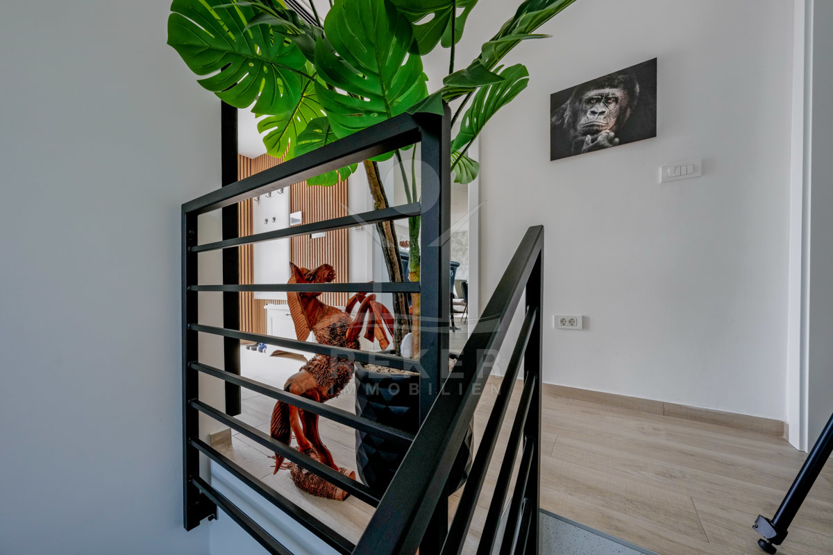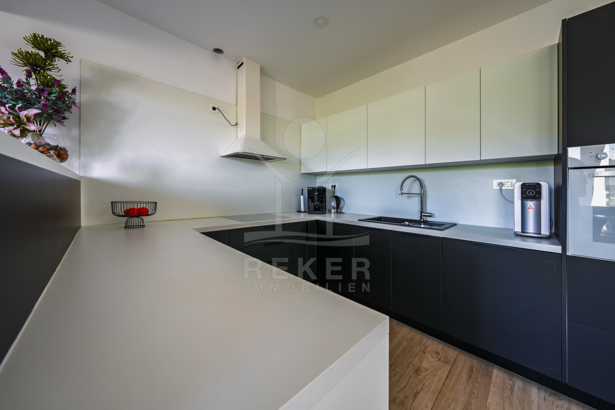 Das gesamte Haus ist hochwertig eingerichtet. Möbel und Design wirken abgestimmt, zeitlos und ruhig. Besonders markant: ausgewählte Kunstobjekte, die sich im ganzen Haus finden. Eine großformatige Wandinstallation, filigrane Metallkunst und eine auffällige Holzskulptur im Treppenbereich – das Zusammenspiel aus Architektur und Kunst verleiht dem Haus Persönlichkeit. Alles, was Sie auf den Bildern sehen, ist im Preis enthalten. Hier zieht man nicht einfach ein – man kommt an.