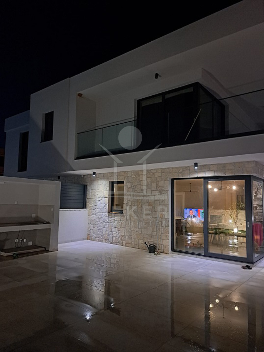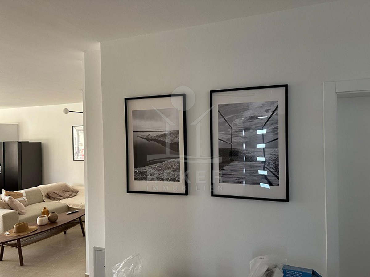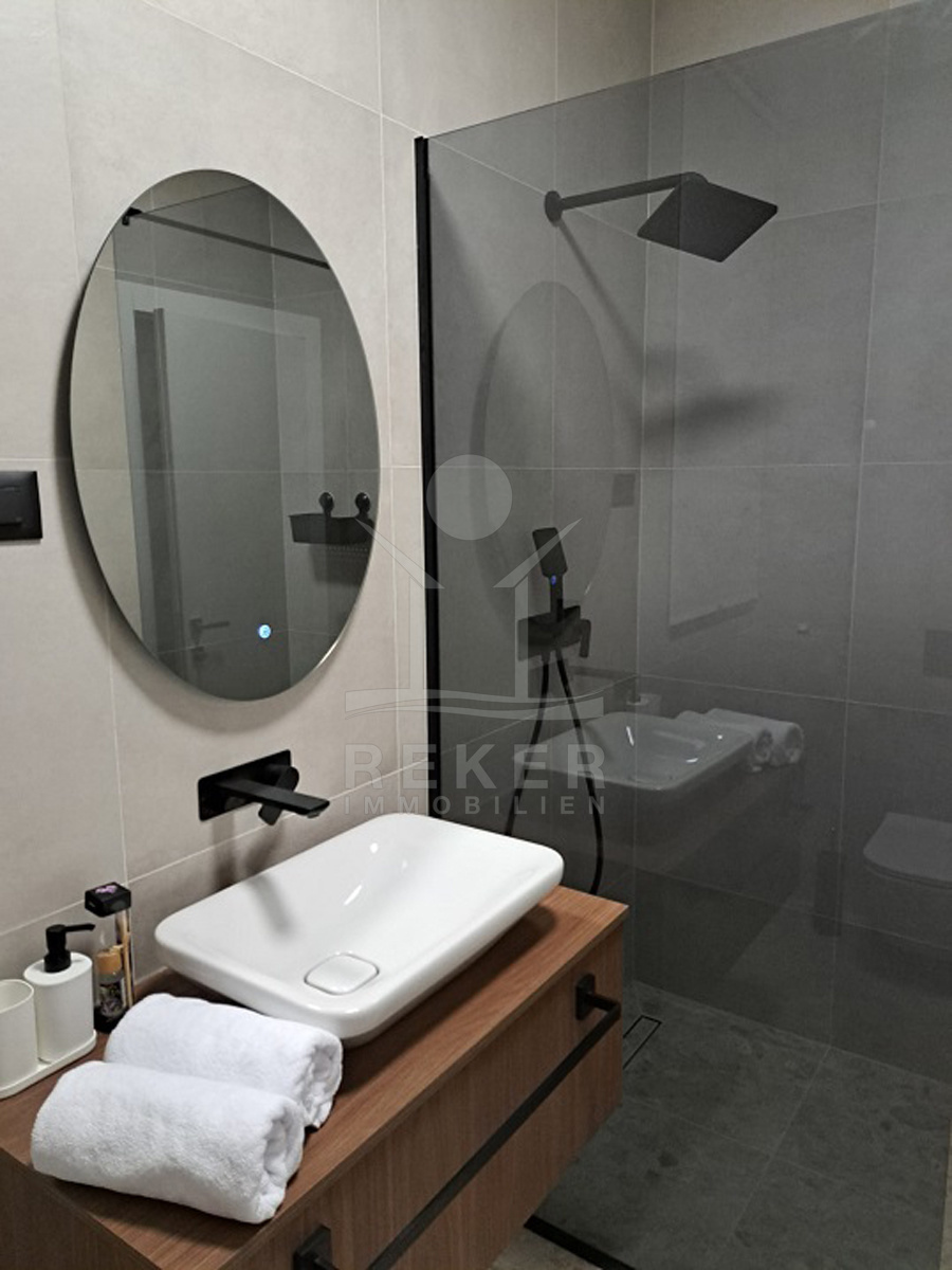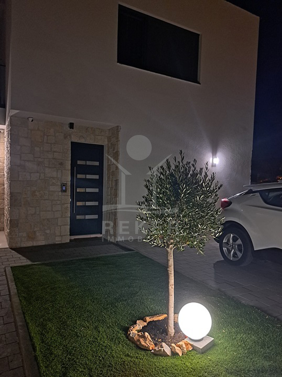 Innen erstrecken sich rund 220 m² Wohnfläche über zwei Etagen. Im Erdgeschoss befindet sich der offene Wohnbereich mit Küche und Essplatz – durch große Fenster verbunden mit der Terrasse. Der Kamin sorgt für eine angenehme Atmosphäre. Dazu kommen ein Gäste-WC, ein Abstellraum und der Technikraum. Im Obergeschoss liegen vier Schlafzimmer – jedes mit eigenem Bad – sowie ein großer Balkon mit Blick zur Küste. Materialien wie Marazzi-Keramik, Spider-Glasgeländer und Natursteine setzen innen wie außen stilvolle Akzente. Für Wohnkomfort sorgt die Daikin-Wärmepumpe (A***), kombiniert mit Fußbodenheizung und Konvektoren. Die Haussteuerung erfolgt bequem per Smartphone – Licht, Klima, Sicherheit und mehr. Ein modernes Zuhause in ruhiger Lage, mit hoher Bauqualität und viel Privatsphäre.