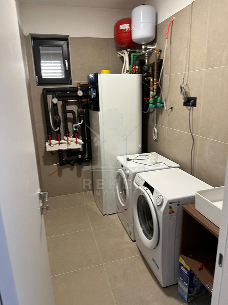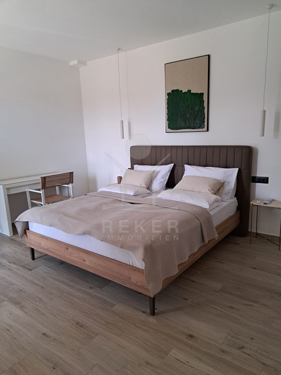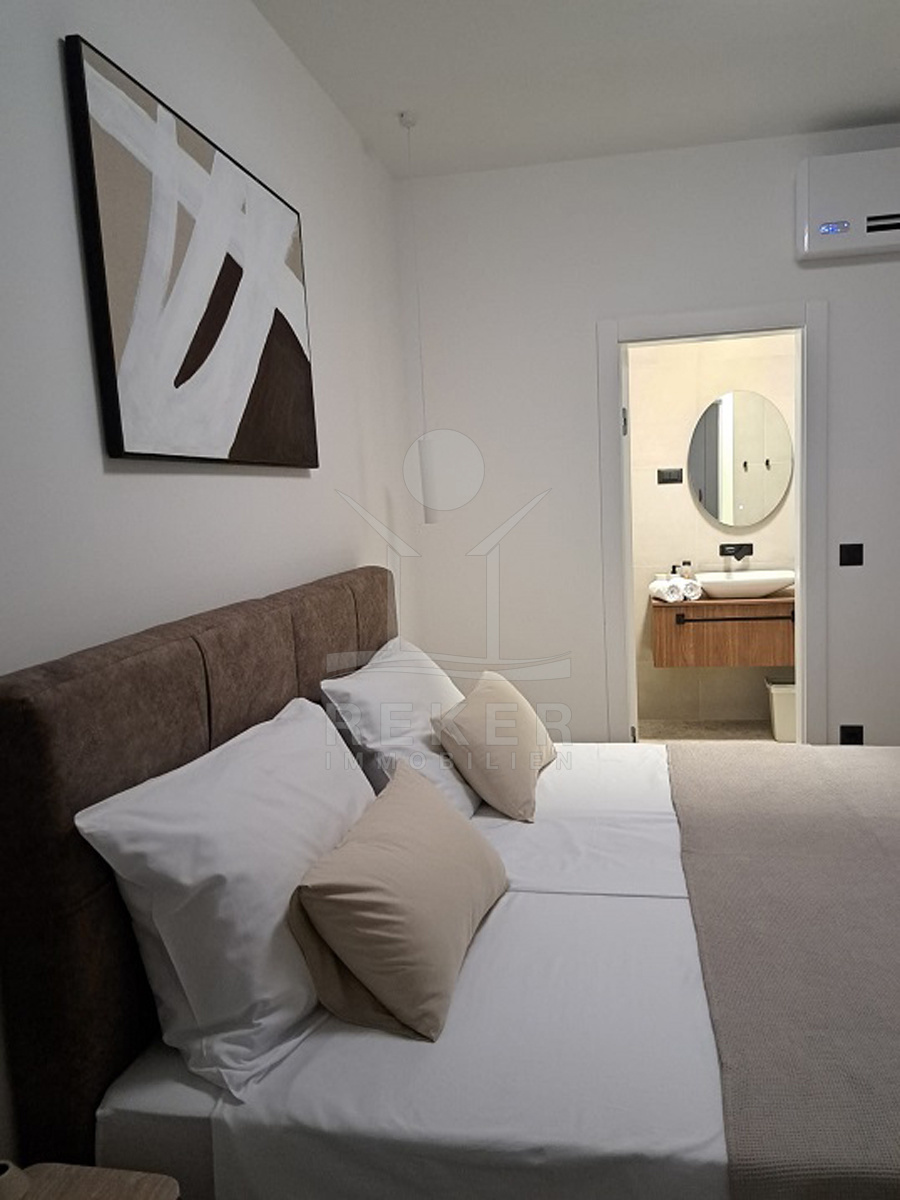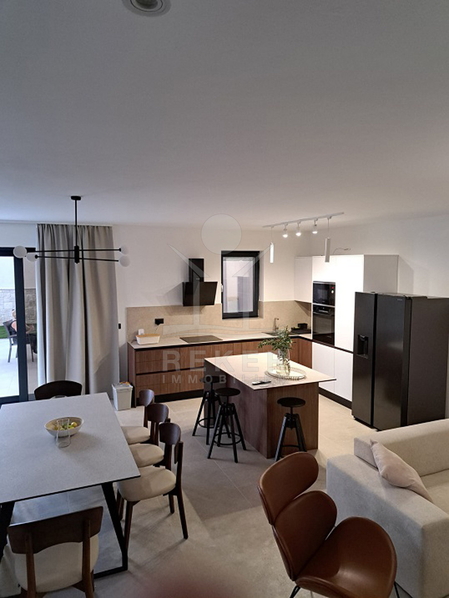 Innen erstrecken sich rund 220 m² Wohnfläche über zwei Etagen. Im Erdgeschoss befindet sich der offene Wohnbereich mit Küche und Essplatz – durch große Fenster verbunden mit der Terrasse. Der Kamin sorgt für eine angenehme Atmosphäre. Dazu kommen ein Gäste-WC, ein Abstellraum und der Technikraum. Im Obergeschoss liegen vier Schlafzimmer – jedes mit eigenem Bad – sowie ein großer Balkon mit Blick zur Küste. Materialien wie Marazzi-Keramik, Spider-Glasgeländer und Natursteine setzen innen wie außen stilvolle Akzente. Für Wohnkomfort sorgt die Daikin-Wärmepumpe (A***), kombiniert mit Fußbodenheizung und Konvektoren. Die Haussteuerung erfolgt bequem per Smartphone – Licht, Klima, Sicherheit und mehr. Ein modernes Zuhause in ruhiger Lage, mit hoher Bauqualität und viel Privatsphäre.