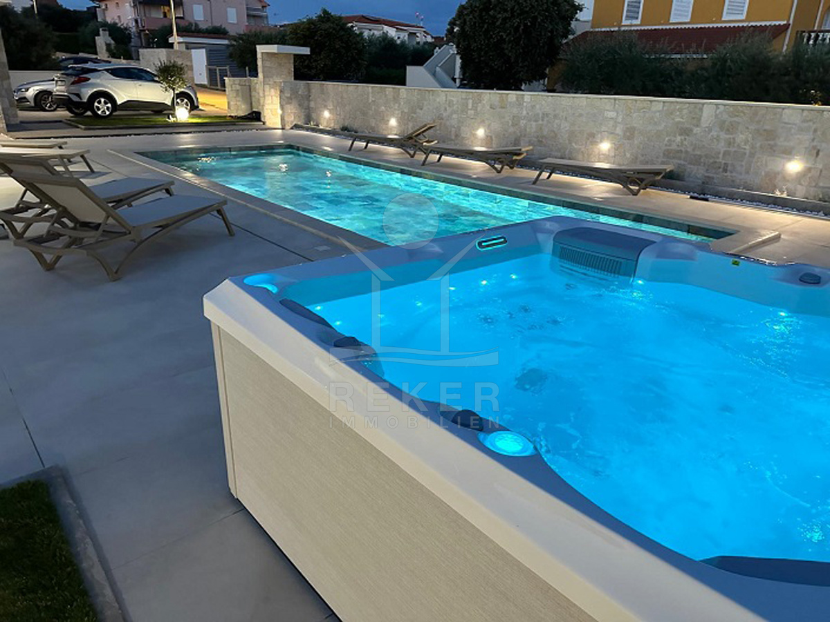 Der Außenbereich wurde ebenso großzügig wie funktional gestaltet: Mittelpunkt ist der edel geflieste Swimmingpool mit Wärmepumpe und kompletter Automatisierung. Für entspannte Stunden sorgt der Whirlpool – besonders am Abend mit der stimmungsvollen Beleuchtung ringsum. Daneben die überdachte Sommerküche mit Grill, Spüle und Induktionskochfeld – ideal für gesellige Abende im Freien. Sonnenliegen, gepflegter Rasen, Solardusche und eine Pergola runden das Bild ab. Alles von einer geschützten Mauer umgeben – Sichtschutz und Privatsphäre sind hier inklusive.