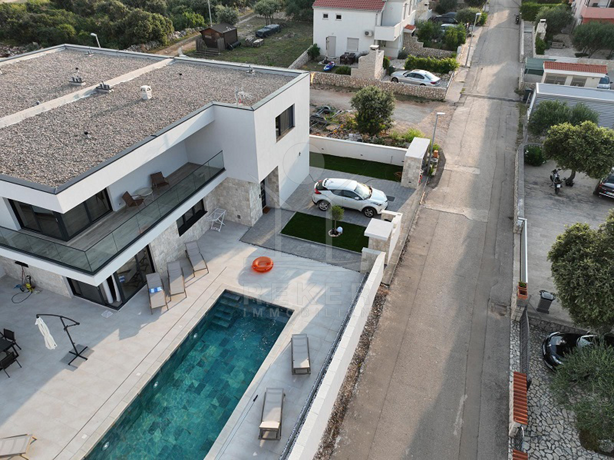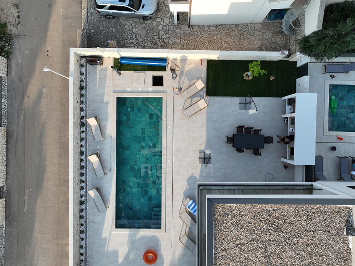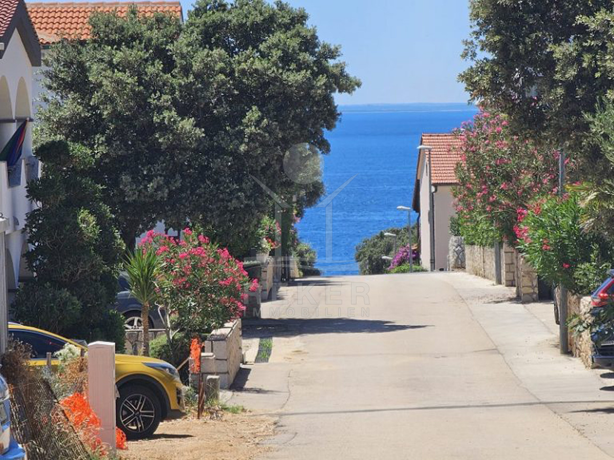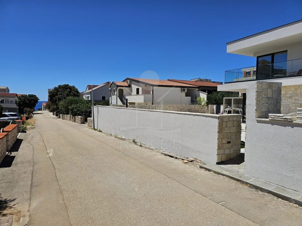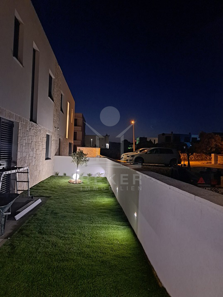 Ruhige Seitenstraße, gepflegte Nachbarschaft, nur rund 300 Meter bis zur Küste – in dieser begehrten Wohnlage von Mandre auf der Insel Pag erwartet Sie eine moderne Stadtvilla mit Komfort auf zwei Ebenen. Das Haus steht auf einem 465 m² großen Grundstück und bietet zwei private Stellplätze direkt auf dem Grundstück, inklusive Autoladegerät. Der Zugang erfolgt über ein elektrisches Einfahrtstor, eingefasst von einer Natursteinmauer. Die Umgebung ist hochwertig bebaut, angenehm ruhig und liegt an der sonnigen Südküste der Insel. Der Meerblick beginnt praktisch am Ende der Straße.