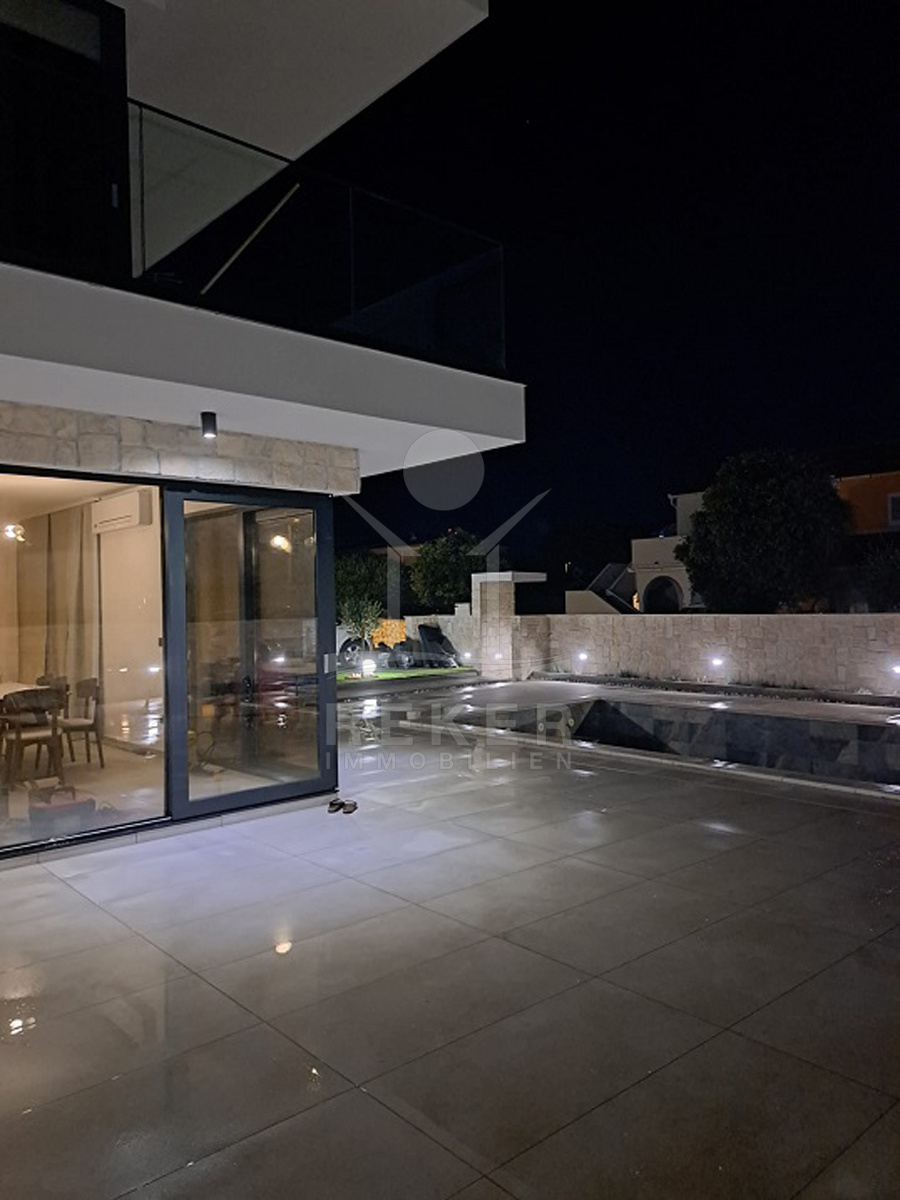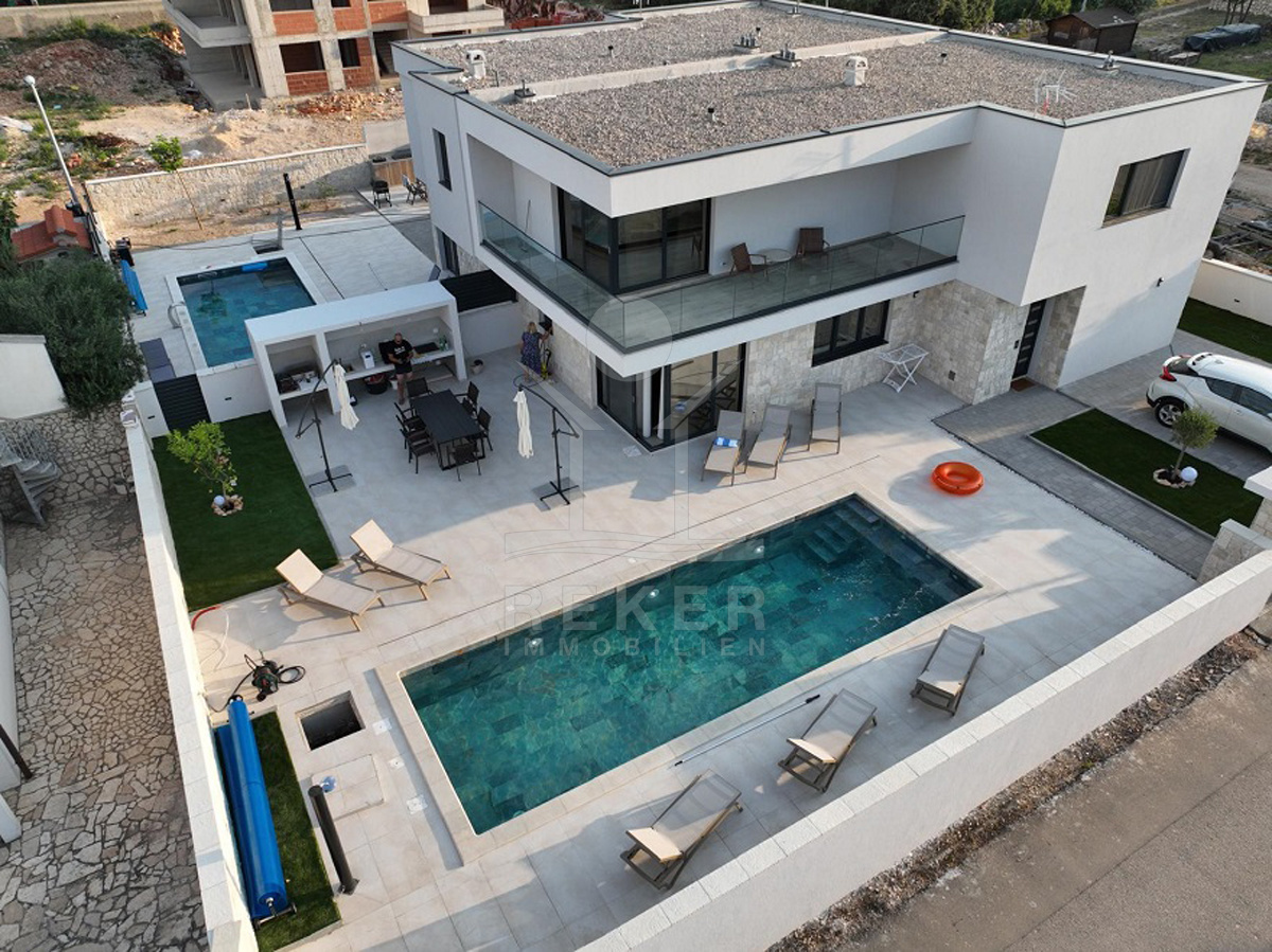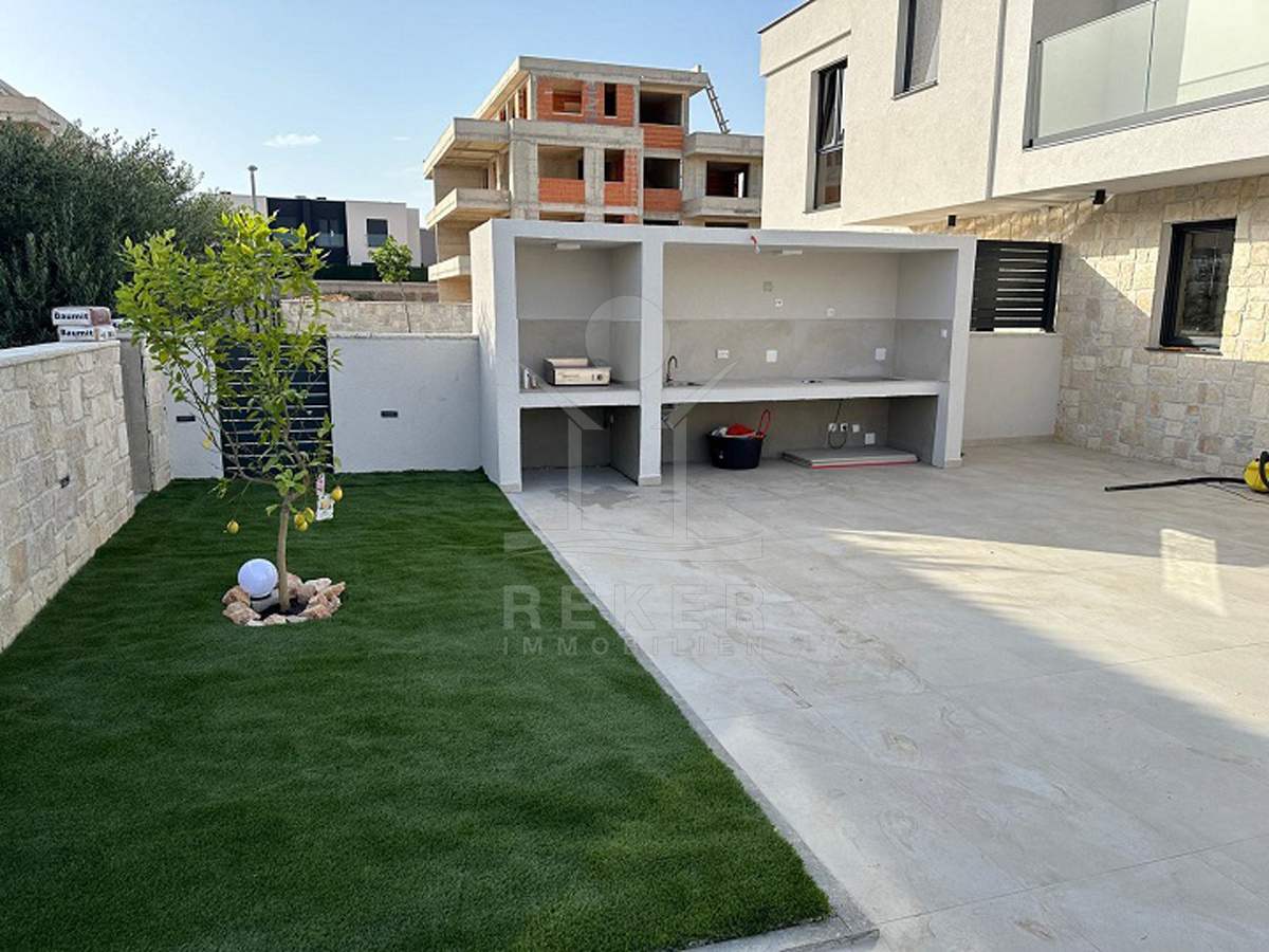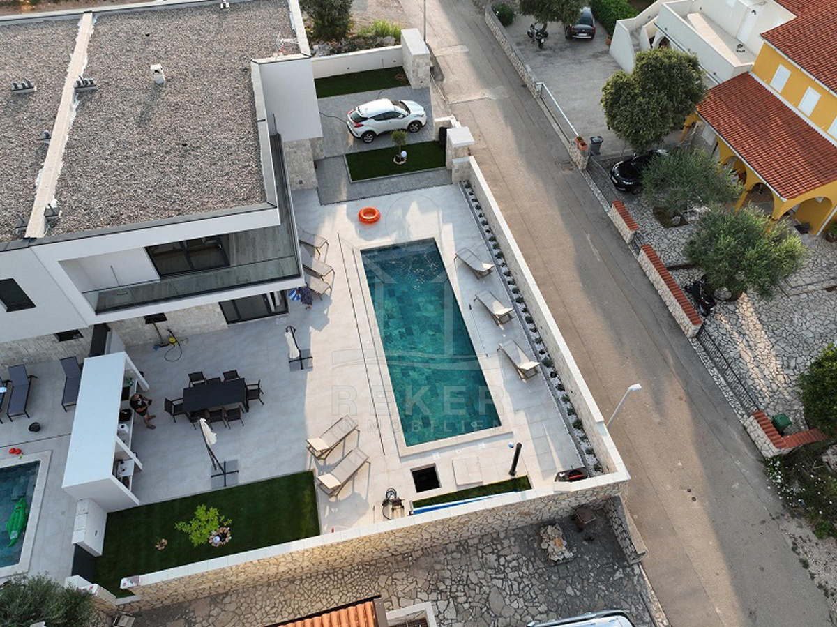 Ruhige Seitenstraße, gepflegte Nachbarschaft, nur rund 300 Meter bis zur Küste – in dieser begehrten Wohnlage von Mandre auf der Insel Pag erwartet Sie eine moderne Stadtvilla mit Komfort auf zwei Ebenen. Das Haus steht auf einem 465 m² großen Grundstück und bietet zwei private Stellplätze direkt auf dem Grundstück, inklusive Autoladegerät. Der Zugang erfolgt über ein elektrisches Einfahrtstor, eingefasst von einer Natursteinmauer. Die Umgebung ist hochwertig bebaut, angenehm ruhig und liegt an der sonnigen Südküste der Insel. Der Meerblick beginnt praktisch am Ende der Straße.