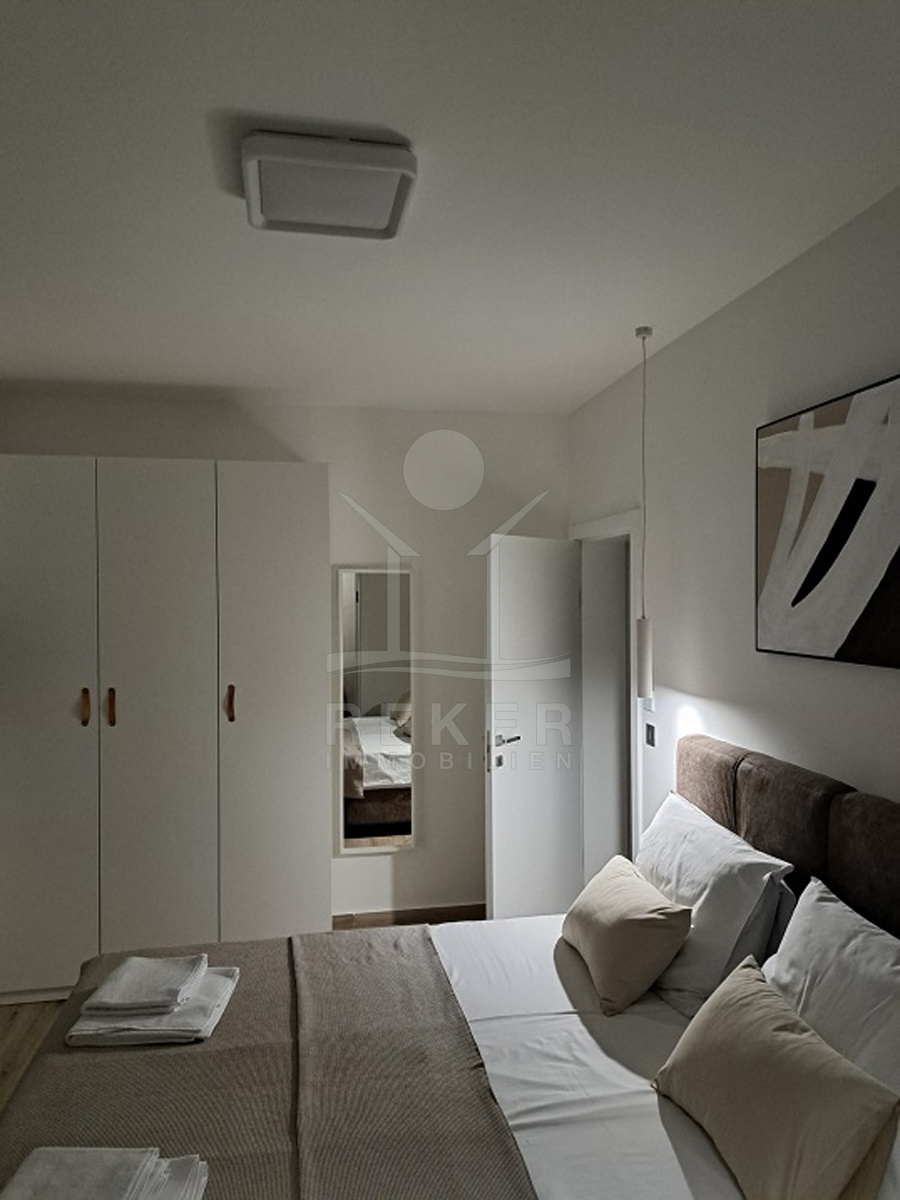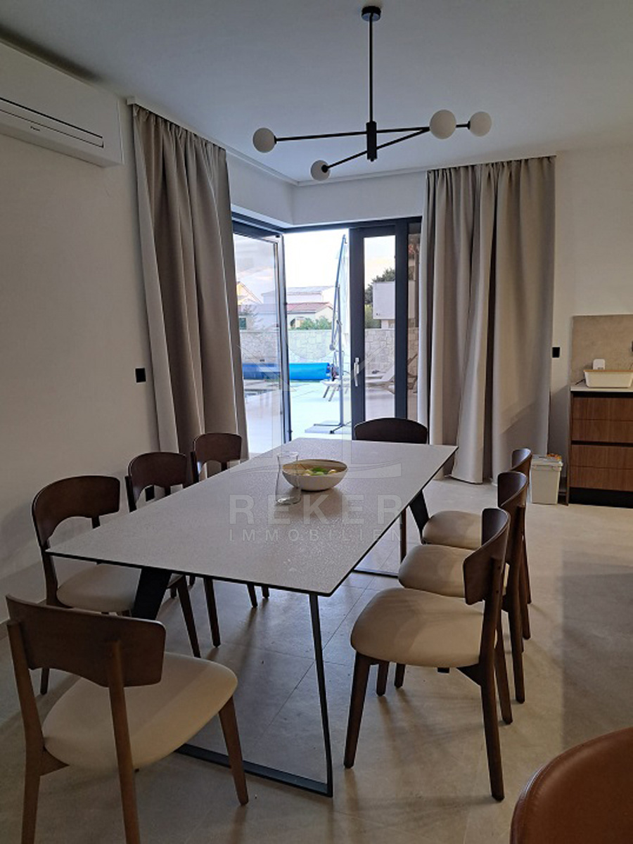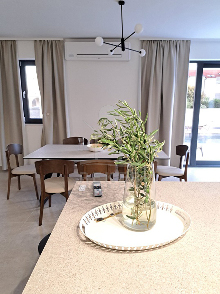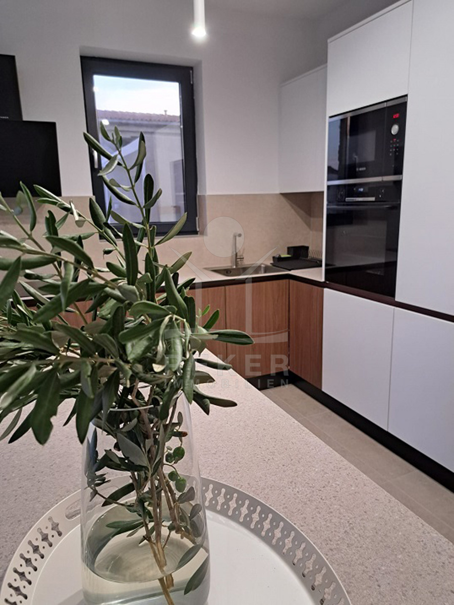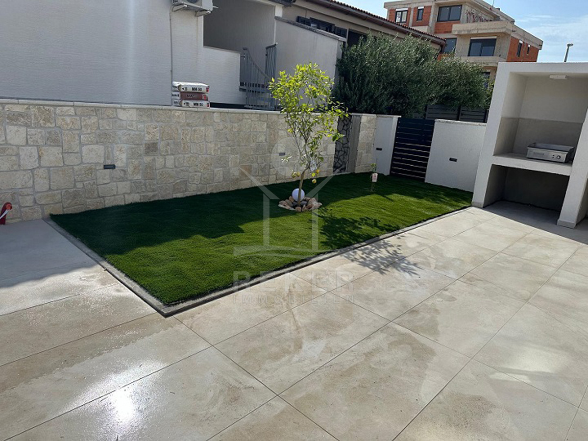Ruhige Seitenstraße, gepflegte Nachbarschaft, nur rund 300 Meter bis zur Küste – in dieser begehrten Wohnlage von Mandre auf der Insel Pag erwartet Sie eine moderne Stadtvilla mit Komfort auf zwei Ebenen. Das Haus steht auf einem 465 m² großen Grundstück und bietet zwei private Stellplätze direkt auf dem Grundstück, inklusive Autoladegerät. Der Zugang erfolgt über ein elektrisches Einfahrtstor, eingefasst von einer Natursteinmauer. Die Umgebung ist hochwertig bebaut, angenehm ruhig und liegt an der sonnigen Südküste der Insel. Der Meerblick beginnt praktisch am Ende der Straße.