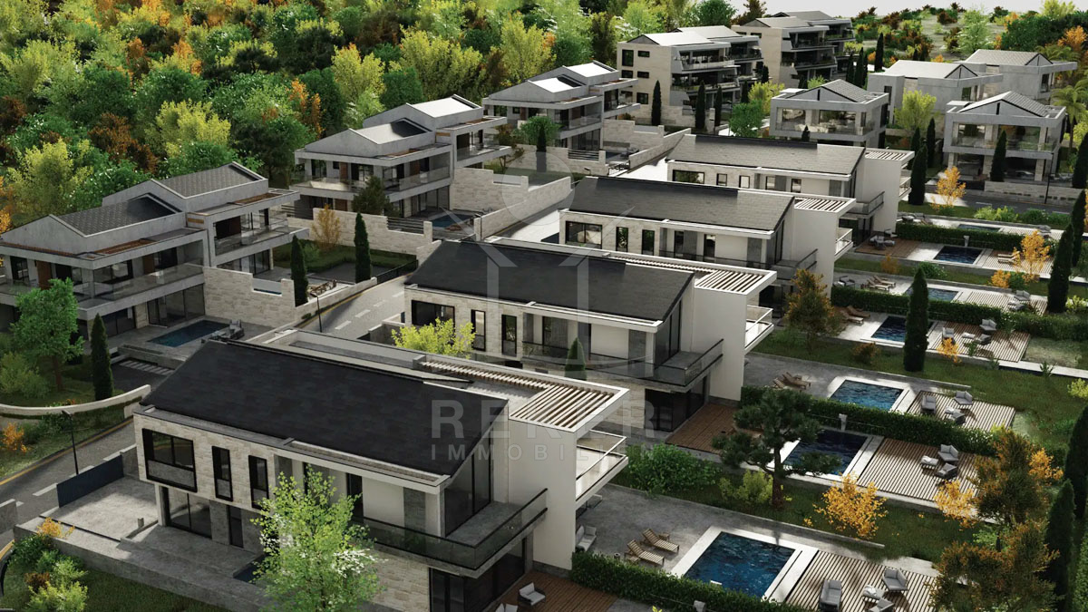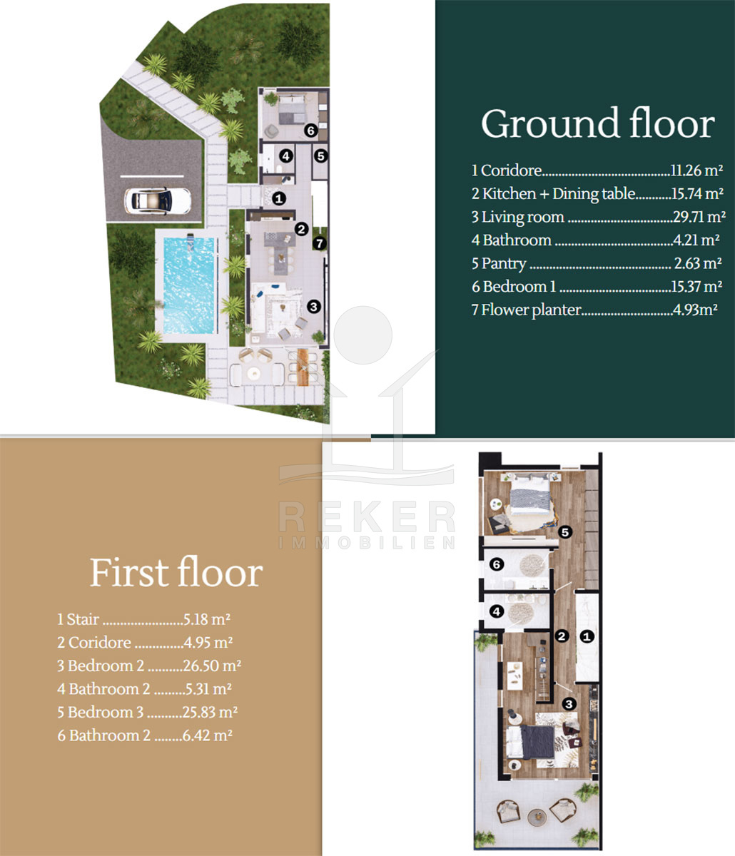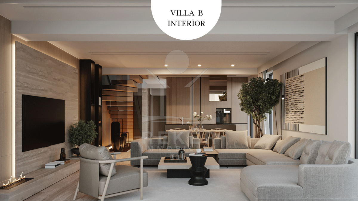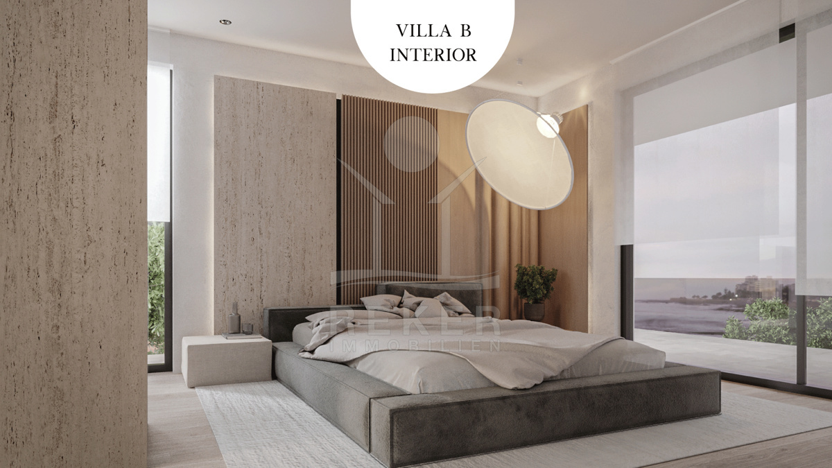 Die Villa wird vollständig möbliert verkauft und besticht durch ein exquisites Interieur mit komfortablen Designermöbeln. Das Erdgeschoss des Hauses wird offen gestaltet sein, mit einem Flur, der in einen großzügigen Wohn-, Ess- und Küchenbereich führt. Hohe Räume mit einer Glasfront sorgen für ein helles Ambiente. Hier befinden sich auch ein Badezimmer, ein Schlafzimmer und eine Speisekammer. Der Zugang zur Terrasse bietet einen offenen Blick auf den Pool. Im Obergeschoss erreichen Sie über eine interne Treppe einen Flur, der zu zwei weiteren Schlafzimmern mit eigenen Bädern führt. Ein Balkon bietet eine herrliche Aussicht.