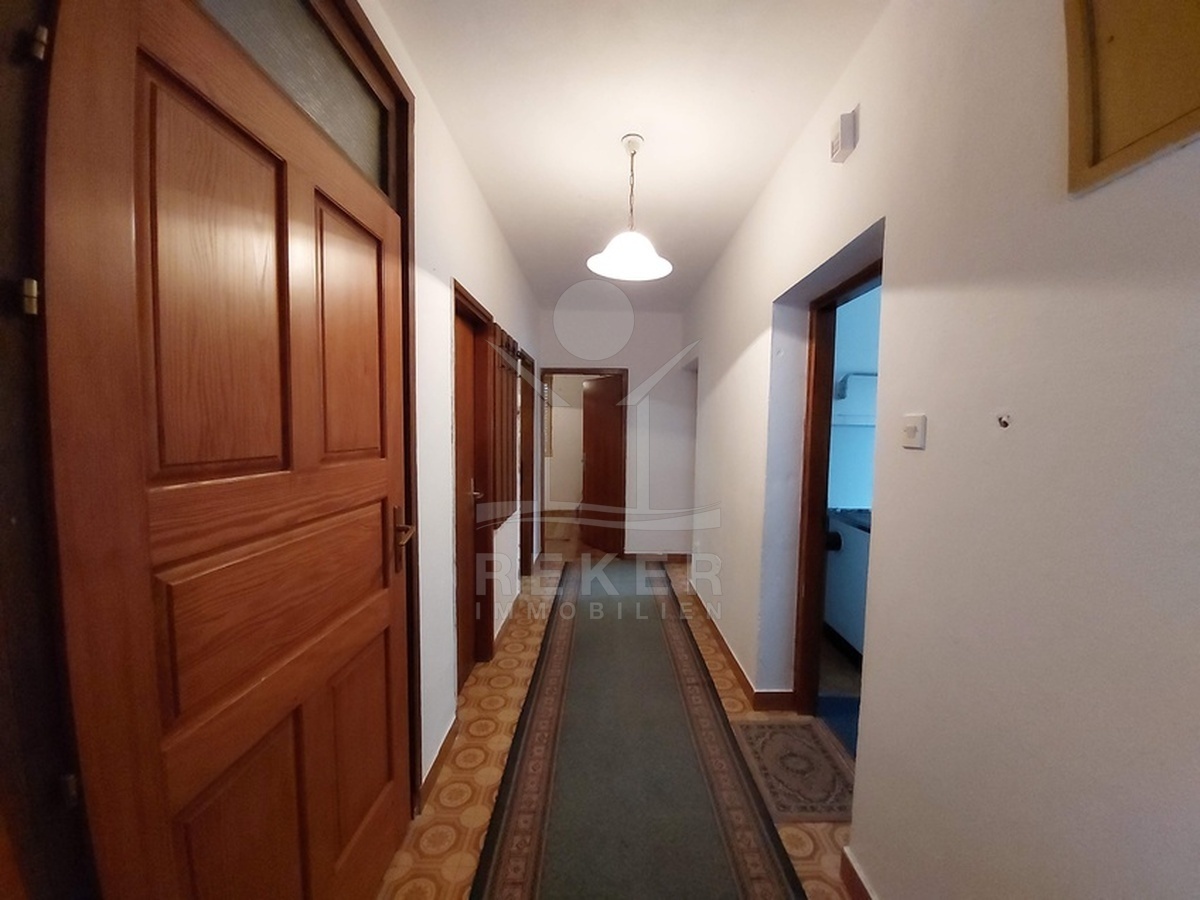 Das Hauptgebäude misst 236 m², verteilt auf drei Etagen. Zwei Balkone bringen Licht und Luft ins Obergeschoss. Innen gibt es sechs Zimmer, davon vier als Schlafzimmer nutzbar. Die Raumaufteilung ist klassisch, das Dachgeschoss roh, aber über feste Treppen erreichbar. Ideal zum Ausbauen. Heizung per Holzofen, Warmwasser per Boiler. Strom, Wasser, Internet – alles da. Es braucht Renovierung, aber das Potenzial ist enorm.