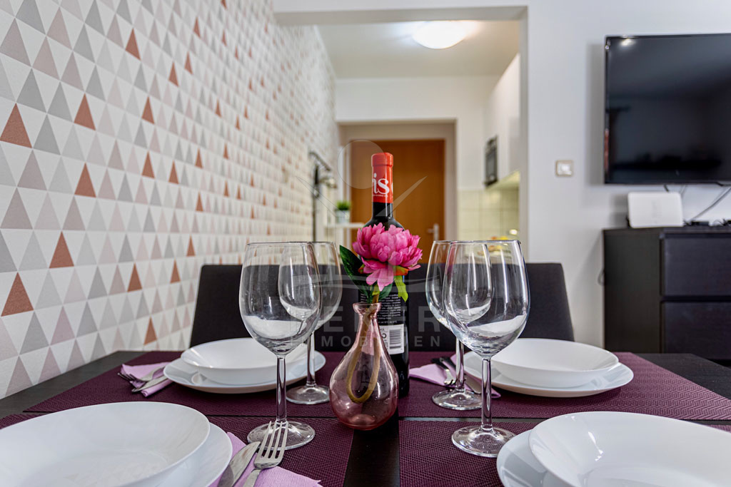 Wohnung Nr. 2 verfügt ebenfalls über ein gemütliches Wohnzimmer mit Sitzecke und Essbereich, eine Küche, ein Badezimmer mit Duschkabine und ein Schlafzimmer. Der Zugang zur schönen Terrasse bietet die Möglichkeit, entspannte Stunden im Freien zu verbringen.