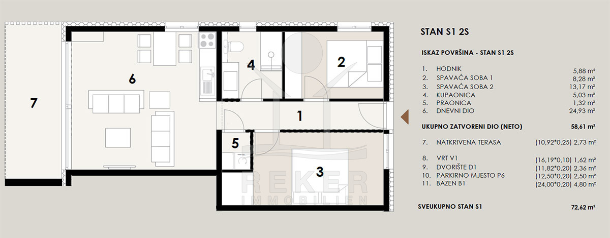 Drei Zimmer auf rund 59 m² Innenfläche bieten durchdachten Wohnkomfort, perfekt für Paare oder kleine Familien. Zwei Schlafzimmer, ein Badezimmer mit moderner Duschkabine und eine praktische Waschküche schaffen klare, funktionale Strukturen. Die offene Wohnküche öffnet sich zur Terrasse – hier genießen Sie morgens Ihren Kaffee mit Blick in den Garten. Die Terrasse misst gut 10 m², direkt davor liegt Ihr privates grünes Stückchen Erde: 16 m² Gartenfläche. Und das Highlight? Ein eigener Swimmingpool mit stolzen 24 m² – herrlich erfrischend und nur für Sie.