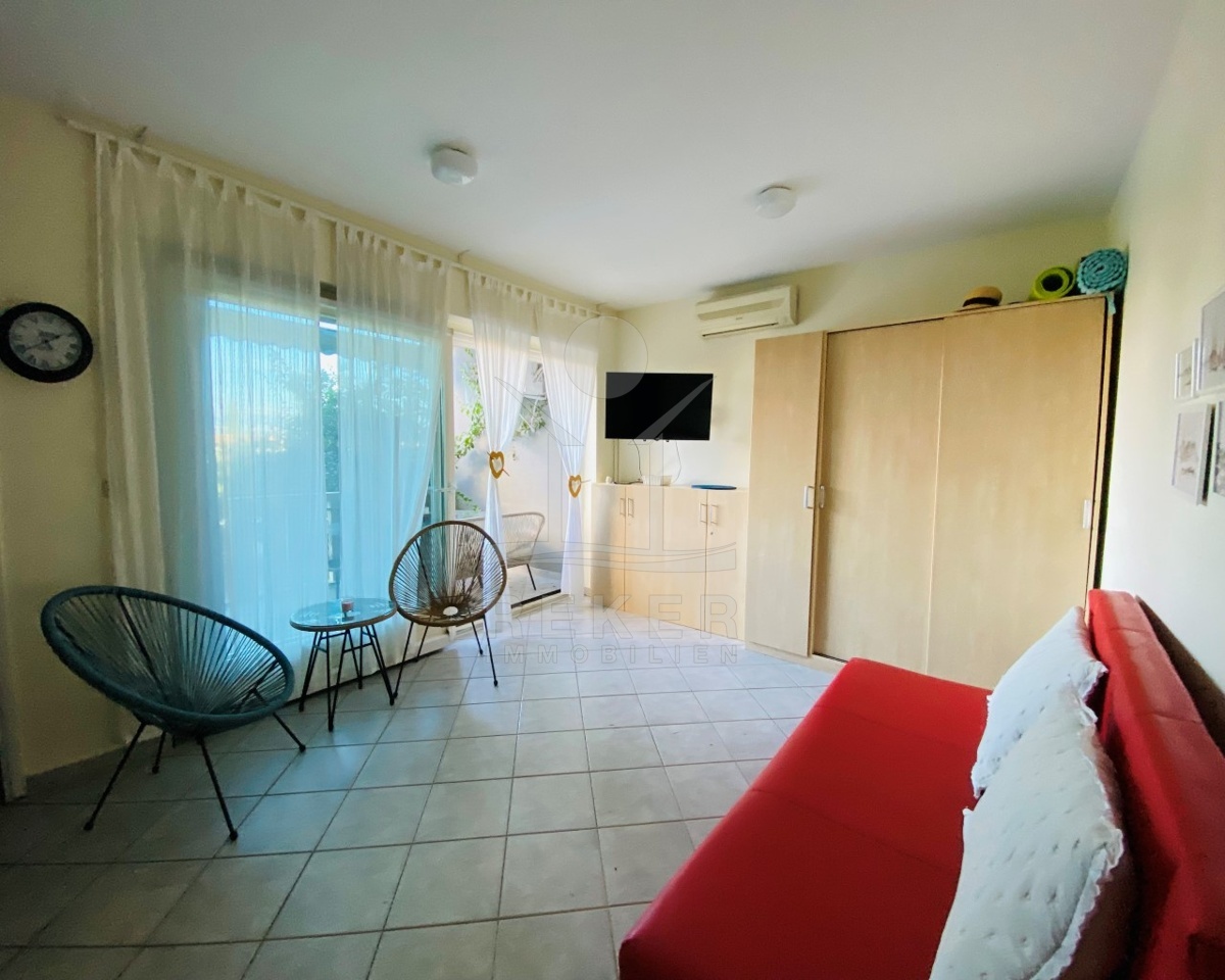 Das Apartment wird vollständig möbliert angeboten und umfasst einen gut durchdachten Grundriss von 39 m². Ein gemütliches Wohnzimmer, ein Schlafzimmer sowie ein modernes Badezimmer sorgen für komfortables Wohnen. Die zugängliche überdachte Terrasse mit 5 m² lädt dazu ein, im Freien Zeit zu verbringen. Ein perfekter Ort, um den Tag ausklingen zu lassen oder eine Tasse Kaffee zu genießen.