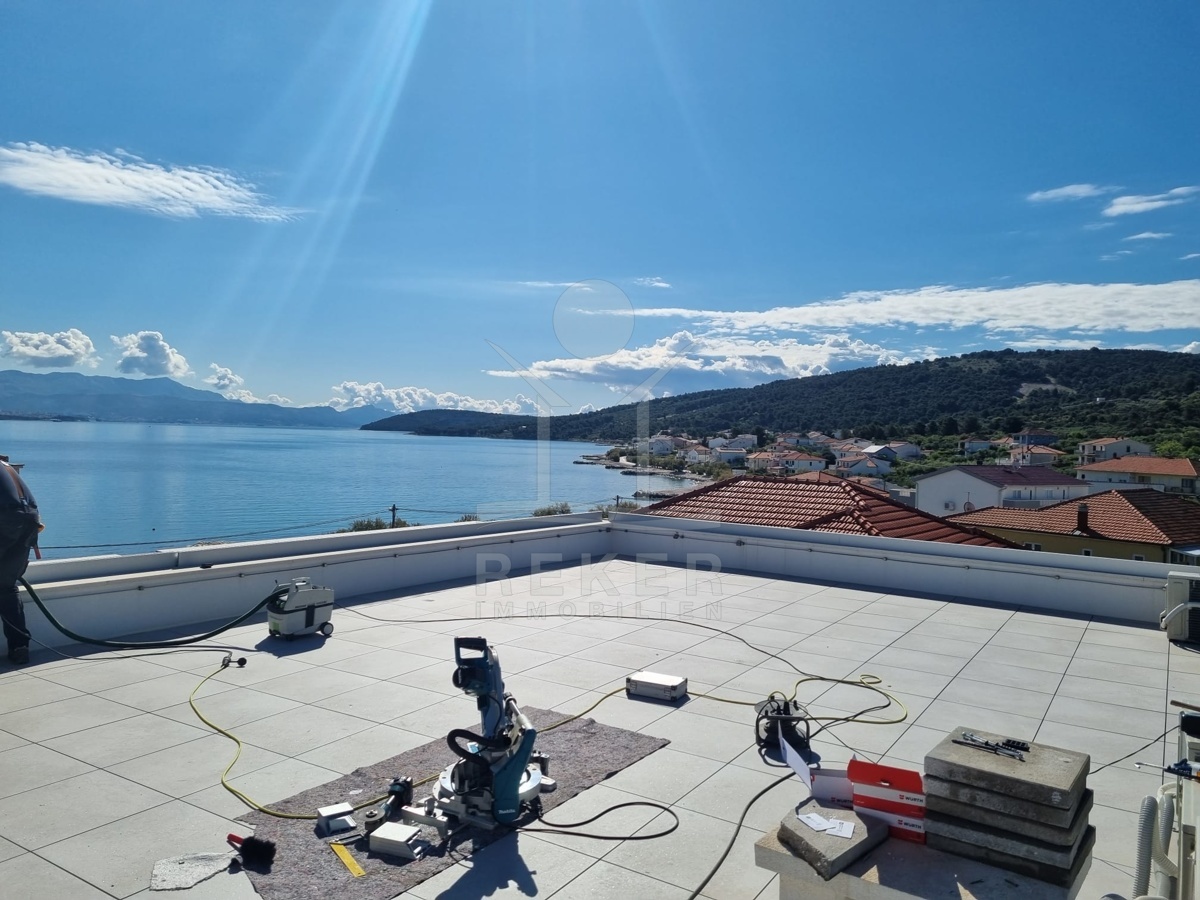 Der Neubau auf der traumhaften Insel Ciovo bietet einen idealen Rückzugsort für Familien und Naturliebhaber. Nur 50 Meter entfernt erstrecken sich wunderschöne Kieselstrände, die einen einfachen Zugang zum kristallklaren Wasser ermöglichen – perfekt für entspannte Tage am Meer. Die Lage ist nicht nur malerisch, sondern auch sehr praktisch: Das kleine Zentrum mit allen wichtigen Annehmlichkeiten ist in unmittelbarer Nähe und lässt keine Wünsche offen. Ciovo, eine bezaubernde Insel in Mitteldalmatien, ist durch eine Brücke mit der historischen Hafenstadt Trogir verbunden, die zum UNESCO-Weltkulturerbe zählt und zahlreiche kulturelle Highlights bietet.