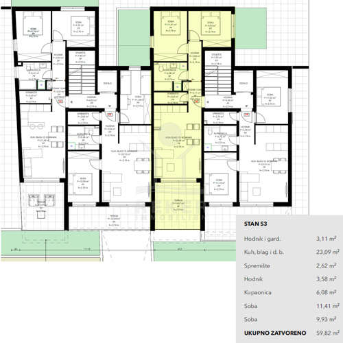 Die Wohnung ist 59,82 m² groß – praktisch aufgeteilt. Sie haben einen Wohn- und Essbereich mit offener Küche (23,09 m²), zwei Schlafzimmer (11,41 m² und 9,93 m²), ein Bad (6,08 m²), einen Flur (3,58 m²), einen Abstellraum (2,62 m²) und einen Eingangsbereich mit Platz für die Garderobe (3,11 m²).