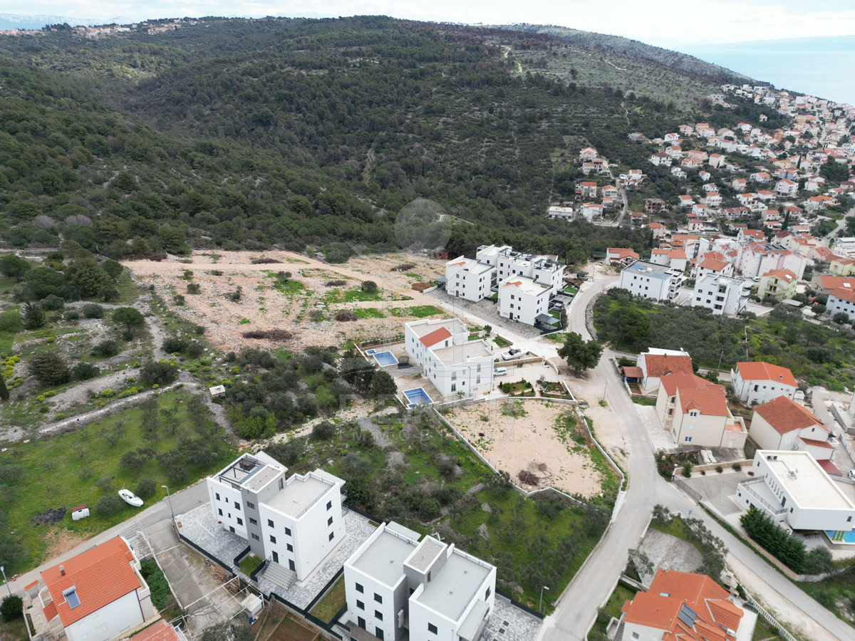 Auf der Insel Čiovo, nicht weit von Trogir, steht dieses moderne Wohnhaus, umgeben von neuen Wohnhäusern. Eine typische dalmatinische Mischung: grüne Landschaft, Meernähe und alles Wichtige für den Alltag gleich um die Ecke. Die Hanglage bringt zwei Vorteile: Privatsphäre und einen weiten Blick bis zur Küste. Weitblick inklusive. Strände, Spazierwege und Freizeitmöglichkeiten? Erreichen Sie alles bequem in ein paar Minuten.