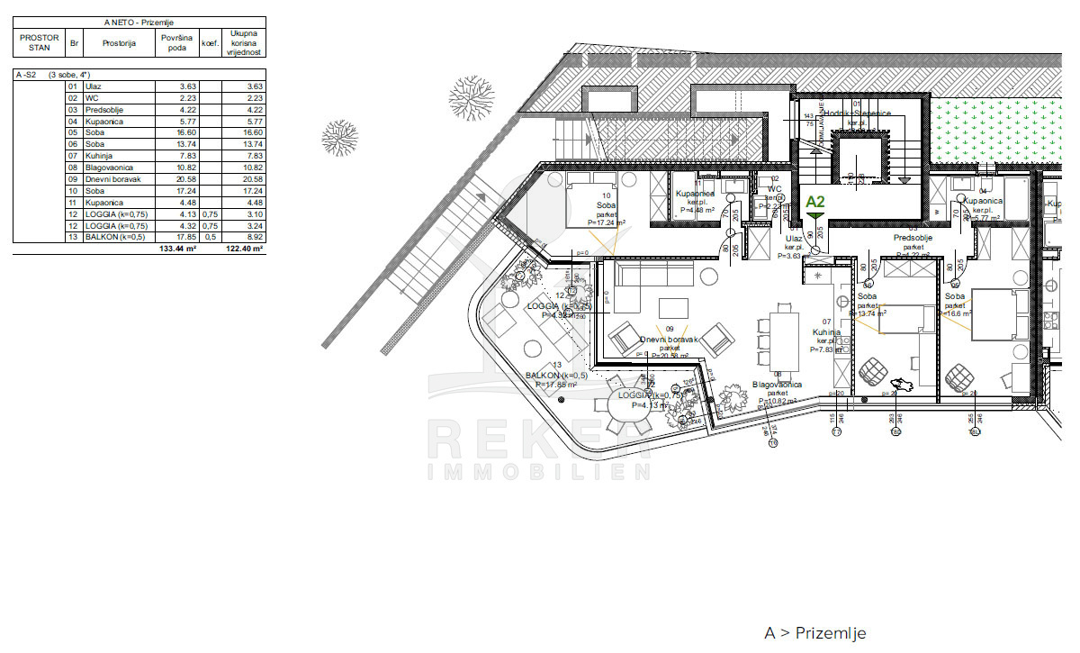 Die Wohnung im Erdgeschoss erstreckt sich über großzügige 122,40 m² Wohnfläche und bietet eine einladende Atmosphäre. Der Eingangsbereich führt in einen hellen Flur, der Ihnen Zugang zu zwei komfortablen Badezimmern, zwei gemütlichen Schlafzimmern und einem praktischen WC bietet. Der offene Wohn-, Ess- und Küchenbereich ist das Herzstück der Wohnung. Hier können Sie Familienabende und gesellige Treffen genießen. Ein besonderer Blickfang ist der angrenzende Balkon von 26 m², der ideal ist, um die frische Luft zu genießen und den Außenbereich zu nutzen.