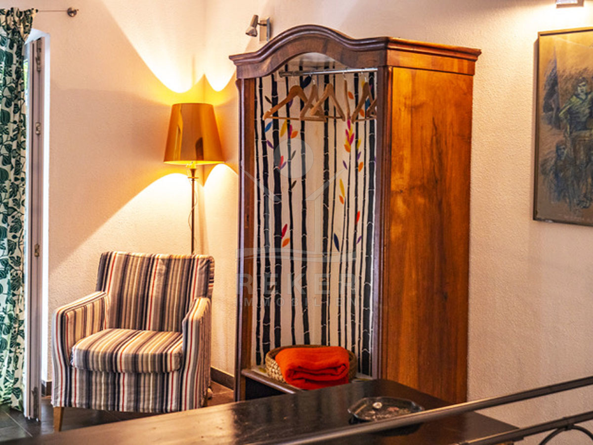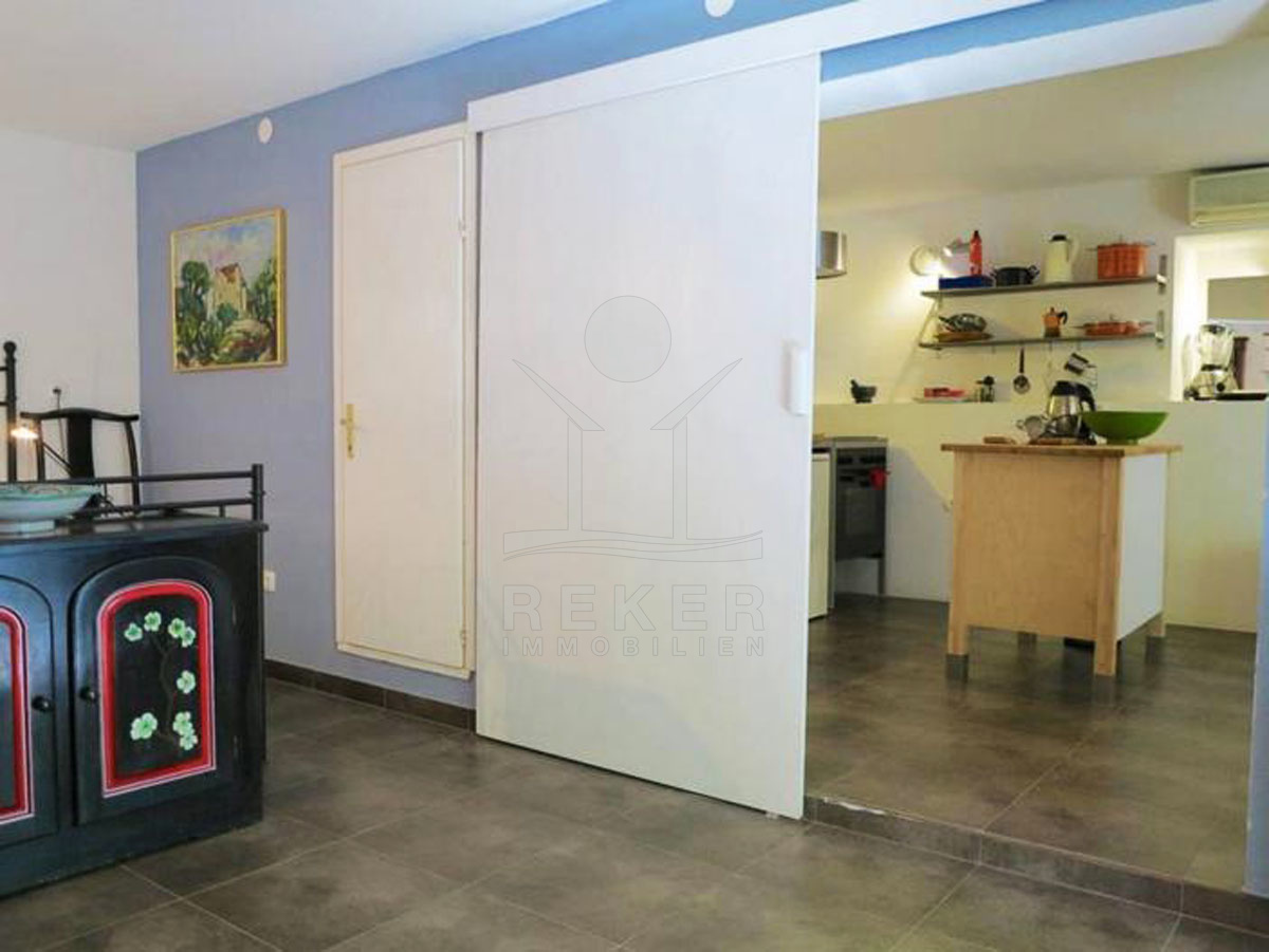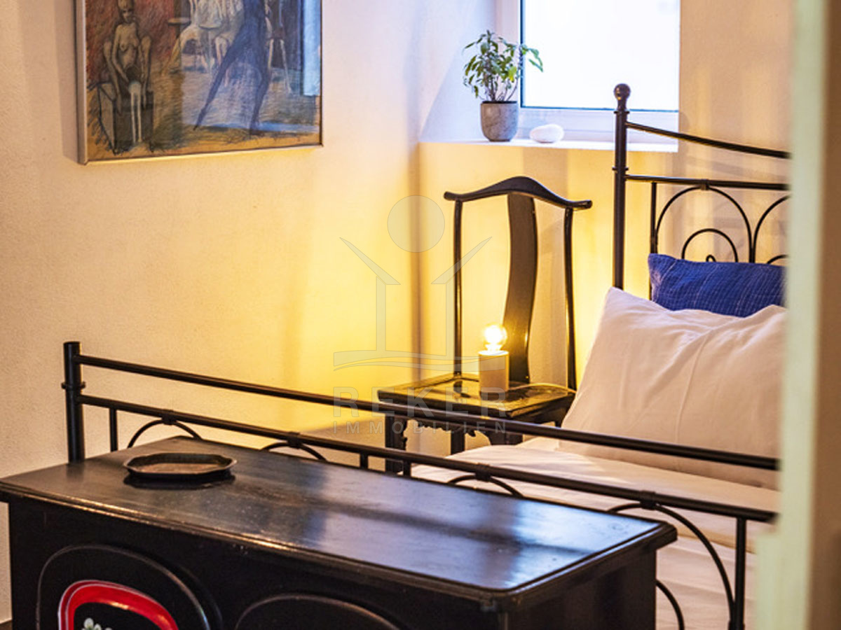 Die einladende Ferienwohnung ist klimatisiert und bietet einen perfekten Rückzugsort für entspannte Tage. Sie besteht aus einem Schlafzimmer und einem gemütlichen Wohnzimmer, die durch eine Innentür verbunden sind, sodass Privatsphäre und geselliges Beisammensein in perfektem Einklang stehen. Die voll ausgestattete Küche verfügt über einen Kühlschrank und bietet genug Platz, um kulinarische Köstlichkeiten zuzubereiten. Das Badezimmer ist sowohl mit einer Badewanne als auch mit einer Dusche ausgestattet, was vielfältige Entspannungsmöglichkeiten bietet. Von der Ferienwohnung aus haben Sie Zugang zum Hof. Eine große Balkontür im Schlafzimmer und eine weitere im Wohnzimmer öffnen sich zu diesem angenehmen Außenbereich, wodurch Licht und frische Luft in die Räume strömen. Ideal für entspannte Stunden im Freien!