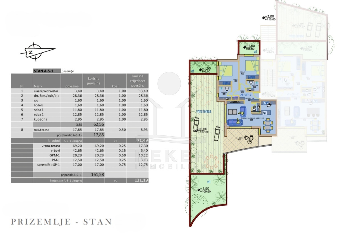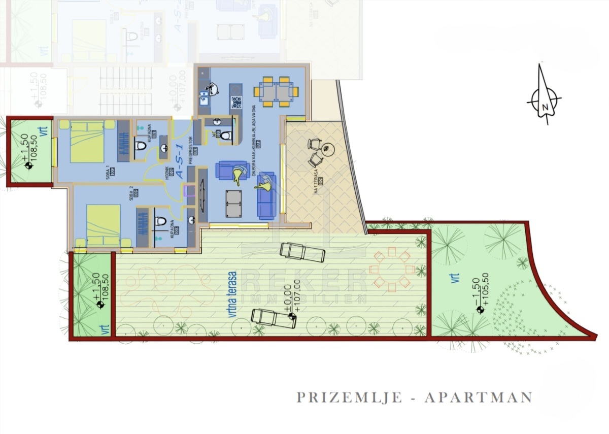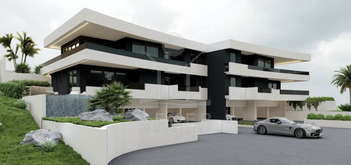 Zwei Schlafzimmer, zwei Bäder – dazu ein offener Wohnbereich mit direktem Ausgang in den eigenen Garten. Die Wohnung A-S1 liegt im Erdgeschoss, doch dank der Hanglage genießen Sie trotzdem freien Blick aufs Meer. Die Glasfront Richtung Osten bringt Licht und Weite – vom Sofa aus geht der Blick bis zur Kvarner Bucht.