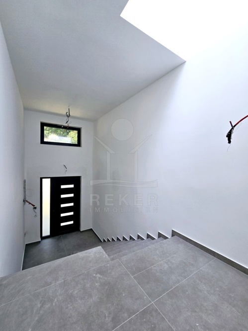 Innen: Hochwertige Keramik und Parkett. Schüco-Fenster. Wärmepumpe zum Heizen und Kühlen. Sicherheitstür, Alarmanlage – alles da. Die offene Küche ist Teil des Wohnraums, Gäste-WC inklusive. Alles durchdacht, ohne Schnickschnack – für Menschen, die Ruhe, Licht und Ausblick schätzen.