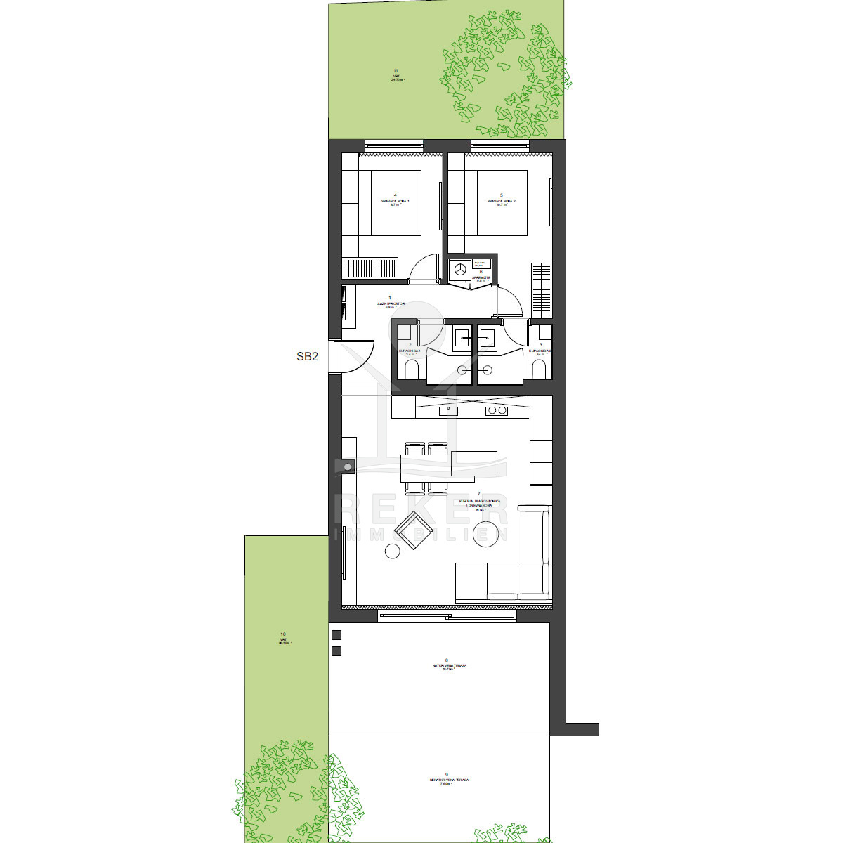 Sie betreten eine Erdgeschosswohnung, die Ihnen auf 68,60 m² modernen Wohnkomfort bietet. Zwei Schlafzimmer und zwei Badezimmer, darunter ein en suite, sorgen für eine klare Struktur. Dazu kommt ein heller Wohn- und Essbereich, der den Alltag angenehm ordnet. Edles Parkett, hochwertige Keramikfliesen sowie Ausstattung von Geberit und Hansgrohe verleihen den Räumen einen wertigen Charakter. Die Fußbodenheizung verteilt die Wärme gleichmäßig, und das Multi-Split-Klimasystem arbeitet mit dem Smart-Home-System zusammen. Technik, die Ihren Alltag erleichtert.