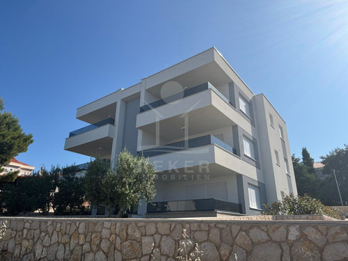 Das Wohnhaus ist ein Neubau mit sechs Wohnungen – zwei pro Etage. Ein klares, modernes Gebäude. Die Wohnungen erreicht man über ein helles Treppenhaus mit Granitstufen und Edelstahlgeländer. Die Fassade ist weiß, der Bau wirkt hochwertig und gepflegt. Auch draußen stimmt alles: angelegte Rasenflächen, Zypressen, Olivenbäume, Steinmauern – und gepflasterte Parkplätze direkt vor dem Haus. Jede Wohnung hat hier ihren festen Stellplatz.