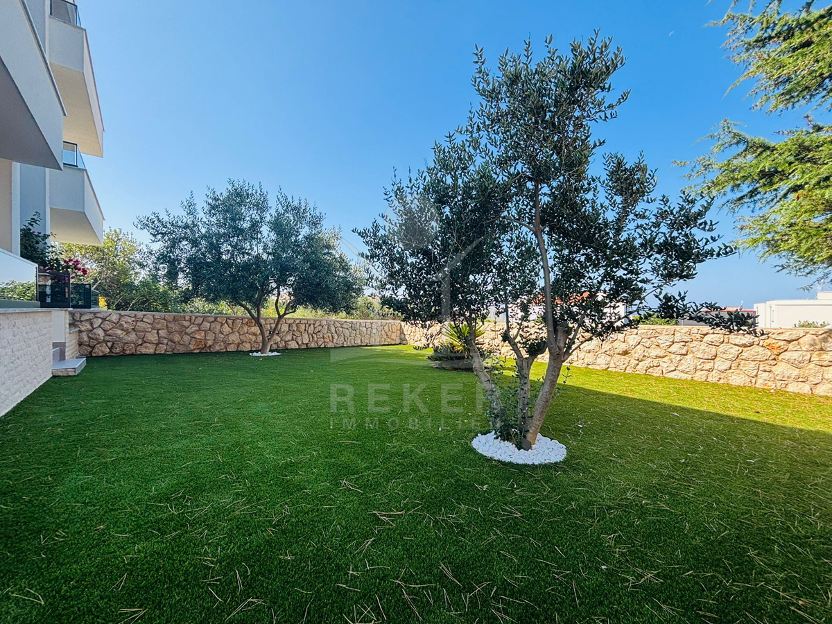 Die Wohnung liegt im Erdgeschoss und hat direkten Zugang zum eigenen Garten. Sie betreten die Wohnung über eine kleine Eingangshalle. Links geht es ins erste Schlafzimmer, geradeaus in das zweite. TV- und Telefonanschlüsse gibt’s in jedem Zimmer. Das Tageslichtbad ist mit hochwertigen Sanitärobjekten und Badmöbeln ausgestattet. Dazu kommt ein separates WC – praktisch für Gäste. Das Herzstück: der offene Wohnbereich mit Küche, Essplatz und Sofa-Ecke. Große Fensterfront zur überdachten Terrasse. Hier geht der Innenraum fließend in den Garten über – insgesamt 128 m², mit Olivenbäumen. Die Leitungen für einen Whirlpool sind bereits verlegt.