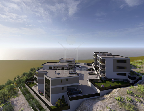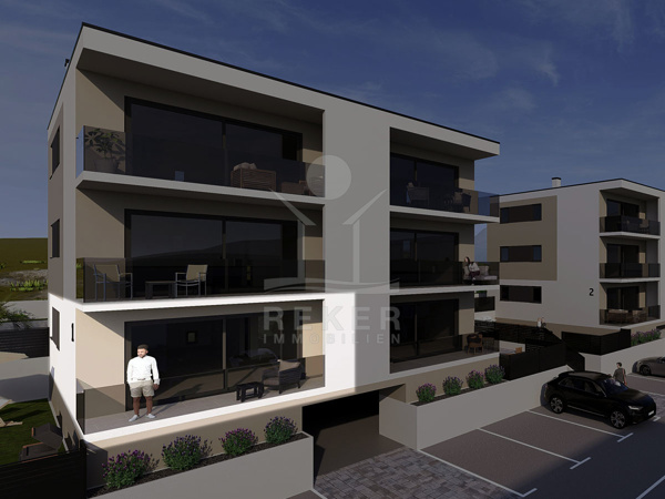 In einem der schönsten Viertel von Novi Vinodolski entsteht der Wohnkomplex. Ruhig gelegen, etwas erhöht über dem Ort, mit viel Grün drumherum. Der Blick auf das Meer und die umliegenden Inseln – großartig. Gleichzeitig sind Supermärkte, Cafés, Restaurants und Erholungsflächen ganz nah. Das historische Stadtzentrum ist in wenigen Minuten erreicht. Die fünf Gebäude fügen sich gut in die Umgebung ein. Jeweils vier Stockwerke: unten der Keller mit Lagerräumen, darüber drei Etagen mit je zwei Wohnungen. Alles hochwertig gebaut, mit solider Betonkonstruktion, wärmegedämmt, erdbebensicher. Rund ums Haus: gepflegte Wege, markierte Parkplätze, Grünflächen mit Zäunen, stimmungsvolle Beleuchtung.