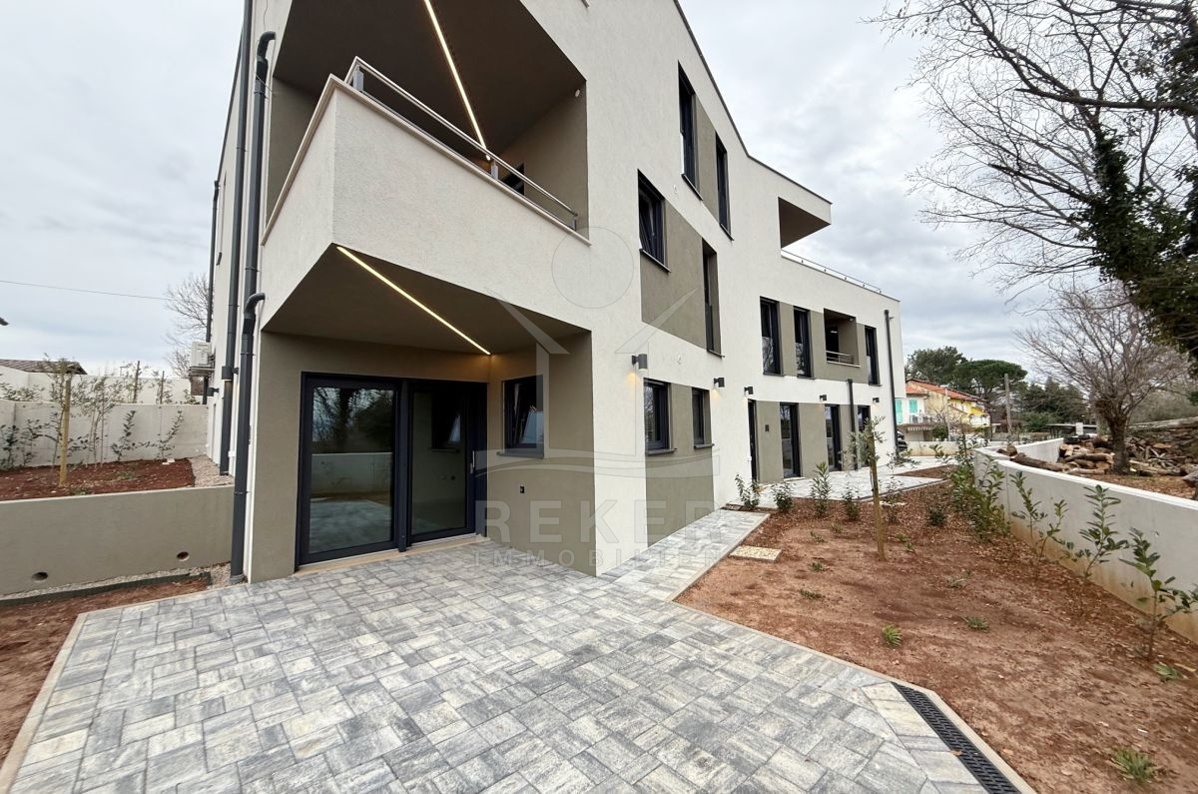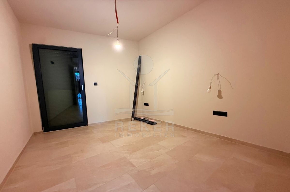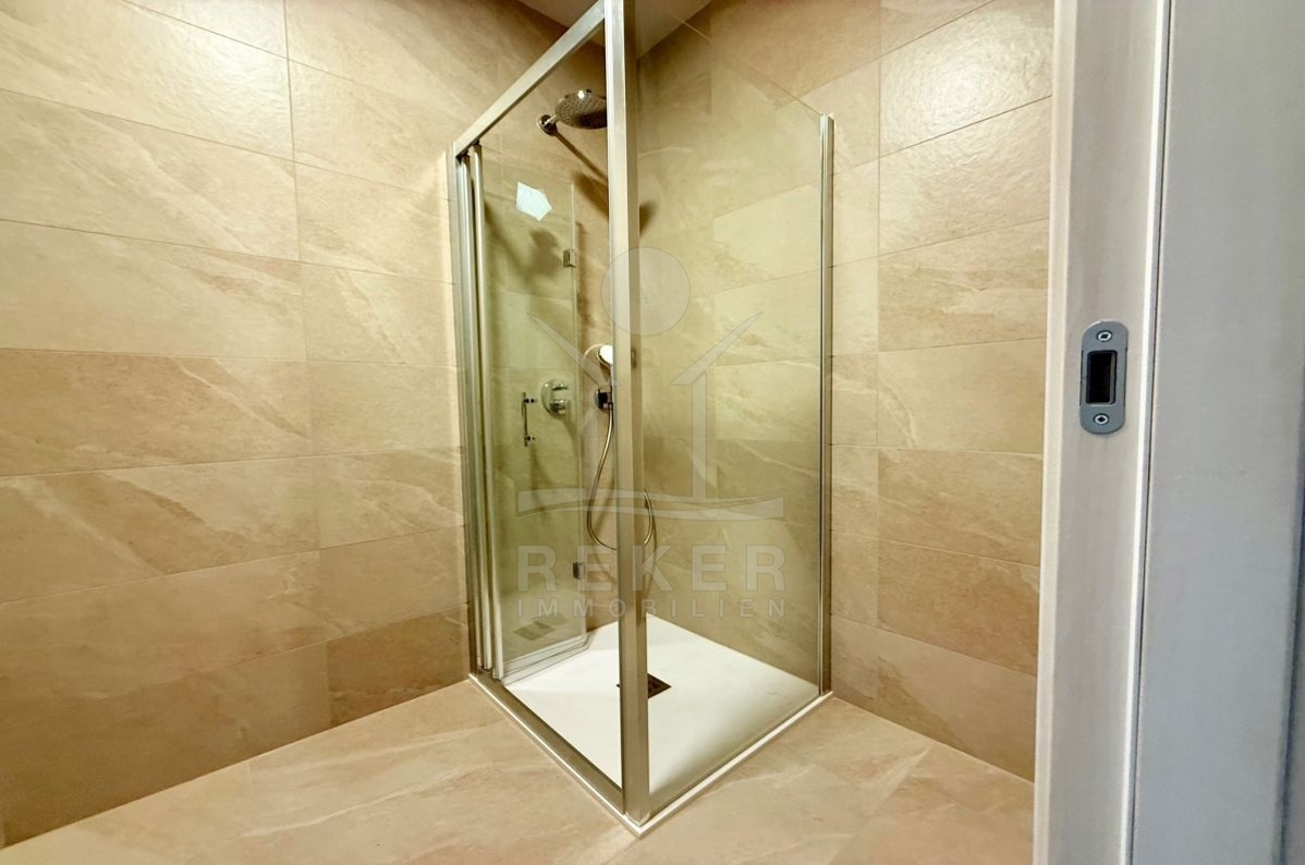 Die Erdgeschosswohnung bietet auf 55,10 m² eine klare und stimmige Aufteilung. Zwei Schlafzimmer und ein offener Wohnbereich schaffen angenehmen Wohnkomfort auf kompakter Fläche. Italienische Innentüren, PVC-Fenster und -Türen mit RAL-Beschichtung sowie Rollläden und Insektenschutzgitter aus Aluminium betonen die hochwertige Bauweise. Das Badezimmer ist komplett ausgestattet, modern gestaltet und leicht zu pflegen. Eine Fußbodenheizung von Vaillant sorgt gemeinsam mit Klimaanlagen in allen Räumen für ein angenehmes Klima zu jeder Jahreszeit.