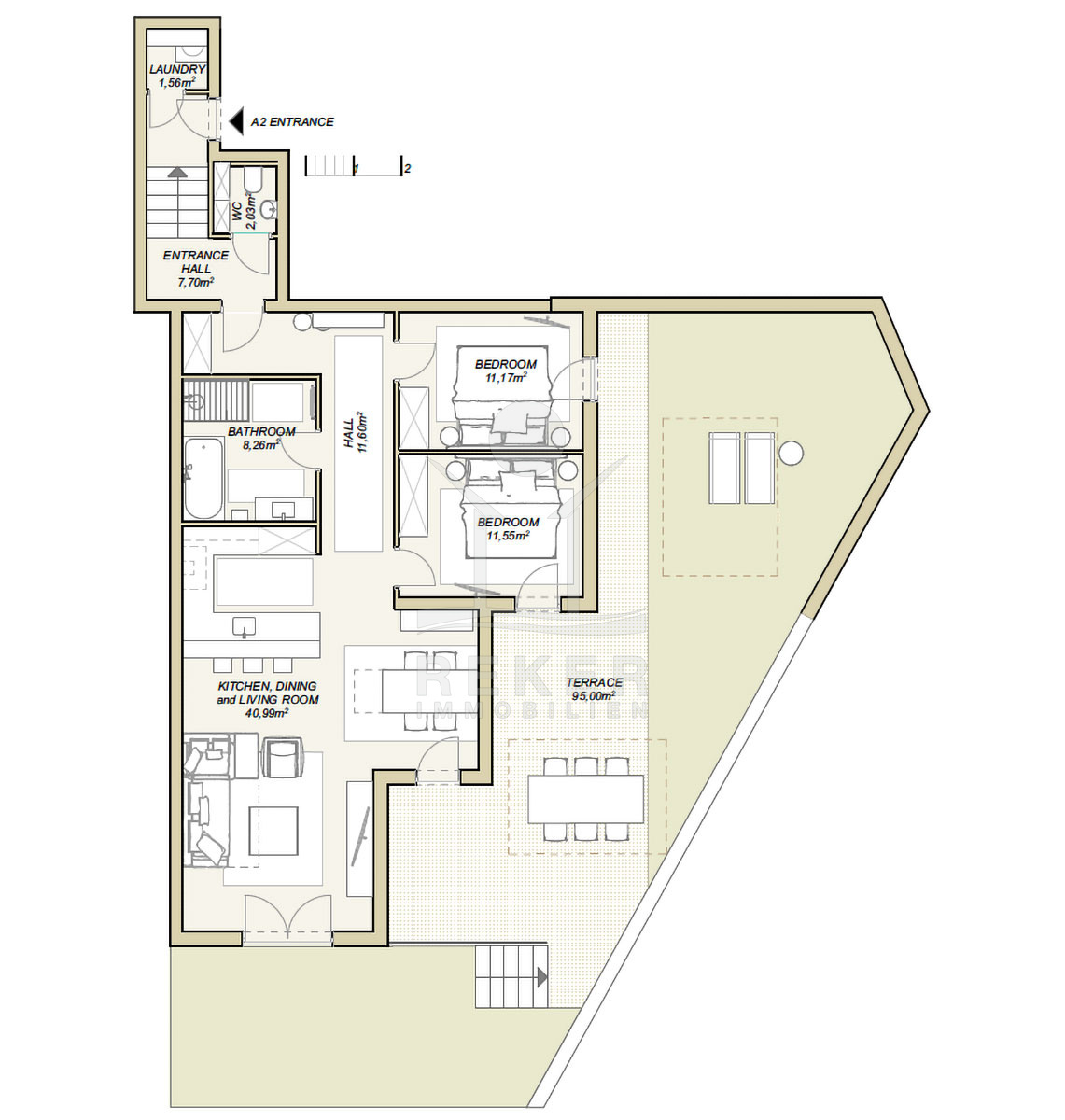 Wohnung A2 liegt komplett auf einer Ebene. Mit 95 m² bietet sie viel Platz und eine durchdachte Raumaufteilung. Alles auf einer Ebene, klingt gut? Der offene Wohnbereich mit Küche, Essplatz und Wohnzimmer ist das helle Zentrum des Alltags. Große Fenster lassen viel Licht hinein und geben immer wieder den Blick aufs Meer frei. So bleibt die Küste ständig präsent. Zwei gleich große Schlafzimmer liegen ruhig nebeneinander – ideal, wenn Sie mit Kindern oder Freunden reisen. Dazu kommen ein großzügiges Bad mit Wanne und ein separates WC. In der Speisekammer mit Waschmaschine lässt sich alles verstauen, was im Alltag nicht offen herumstehen soll. Die Ausstattung? Modern, gepflegt und auf 4-Sterne-Niveau.