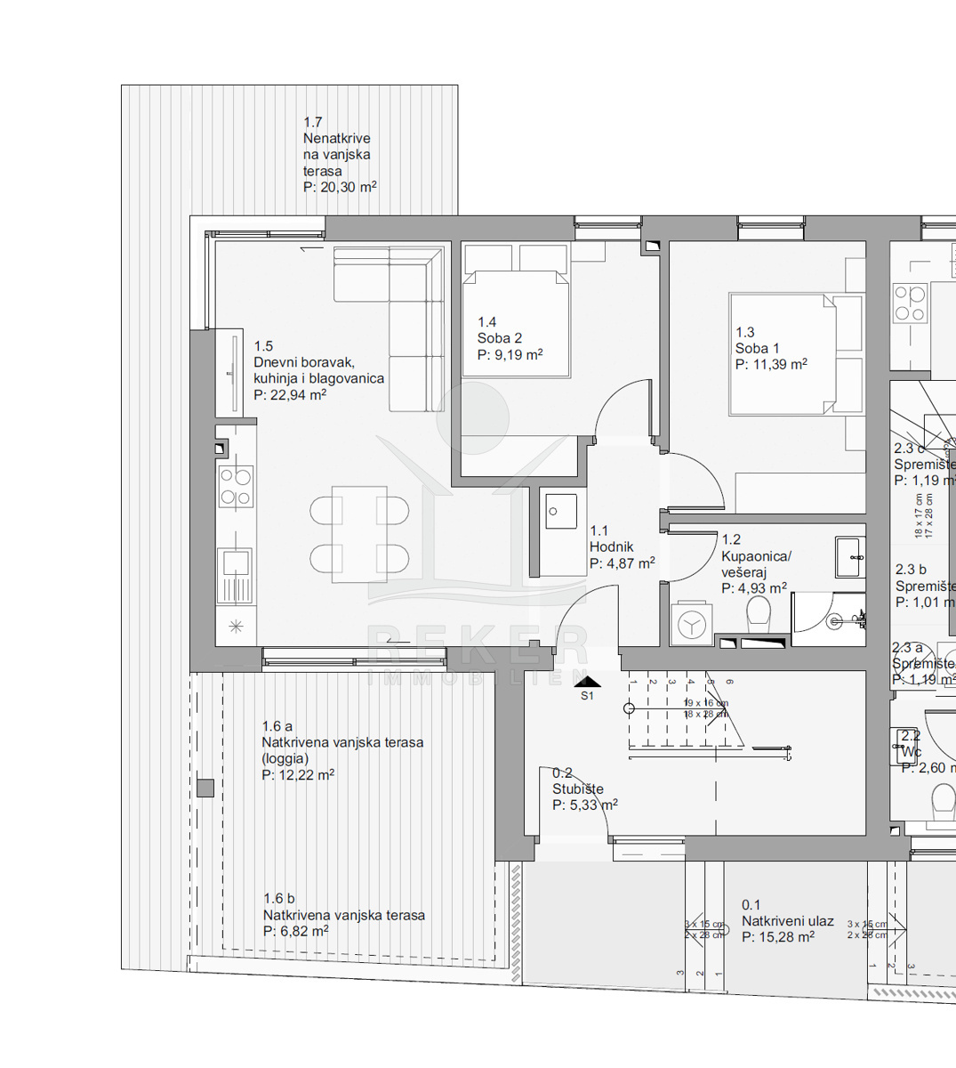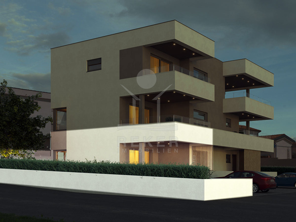 Das Gebäude umfasst vier Wohnungen auf drei Ebenen. Im Erdgeschoss und im ersten Stock entstehen zwei identische Einheiten. Darüber befindet sich das Penthouse mit großzügigem Blick auf das Meer. Eine weitere Wohnung erstreckt sich über zwei Etagen, unten mit Wohnbereich, oben mit Schlafzimmern. Jede Einheit bietet eine eigene Terrasse oder einen Balkon, perfekt, um die Umgebung auf sich wirken zu lassen. Die Architektur überzeugt mit klarer, moderner Formensprache und einem Fokus auf Raumgefühl und Aussicht.