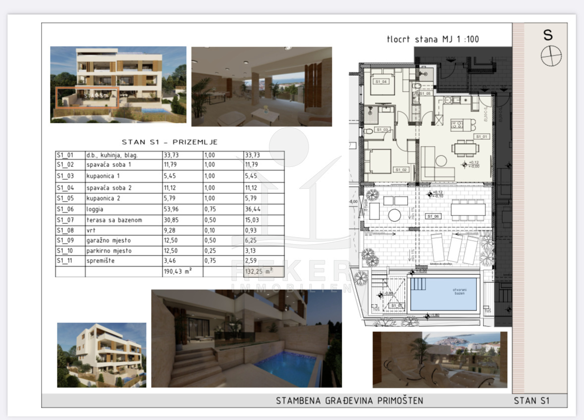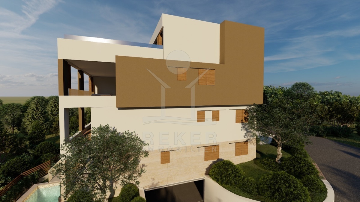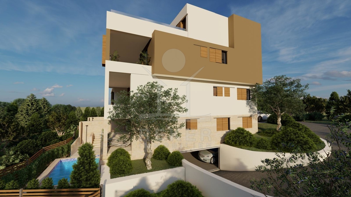 Primošten, ein Küstenort, der Ruhe und Meeresnähe verbindet. Nur rund 400 Meter trennen dieses Neubauprojekt vom Wasser. Die Lage ist ruhig und von Grün umgeben. Das Grundstück liegt in einer leichten Hanglage, was den Wohnungen einen schönen Blick und gute Belichtung ermöglicht. Fertigstellung: 2025. Insgesamt gibt es sieben Wohnungen, verteilt auf vier Etagen. Jede Etage beherbergt zwei Wohnungen, außer das oberste Geschoss: Dort liegt ein großzügiges Penthouse. Alle Einheiten sind bequem mit dem Aufzug erreichbar. Die Fassade ist hell, die Holz-Elemente geben dem Bau Charakter. Große Fenster bringen viel Licht nach innen. Im Erdgeschoss genießt jede Wohnung einen eigenen Pool. Jede Einheit verfügt über mindestens einen Garagenstellplatz, ein klarer Vorteil, besonders in Meeresnähe. Weitere Außenstellplätze stehen zusätzlich zur Verfügung.