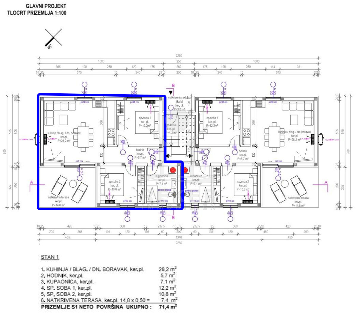 Die Immobilie mit einer Wohnfläche von 71 m² und einem Gartenanteil von 56 m² befindet sich in einem Wohnhaus mit insgesamt 4 Wohnungen, die so angelegt sind, dass zwei Wohneinheiten einen gemeinsamen Zugang haben, während die anderen zwei über einen separaten Zugang verfügen. Dieses Konzept gewährleistet den Bewohnern ein Höchstmaß an Privatsphäre. Der Neubau aus dem Jahr 2024 bietet moderne Ausstattungsmerkmale wie eine Videogegensprechanlage, Sicherheitstüren, 3-fach verglaste Fenster, elektrische Jalousien, Insektenschutzgitter, Fußbodenheizung in den Bädern und LED-Beleuchtung in allen Räumen. Ein Parkplatz im Innenhof steht den Bewohnern zur Verfügung.