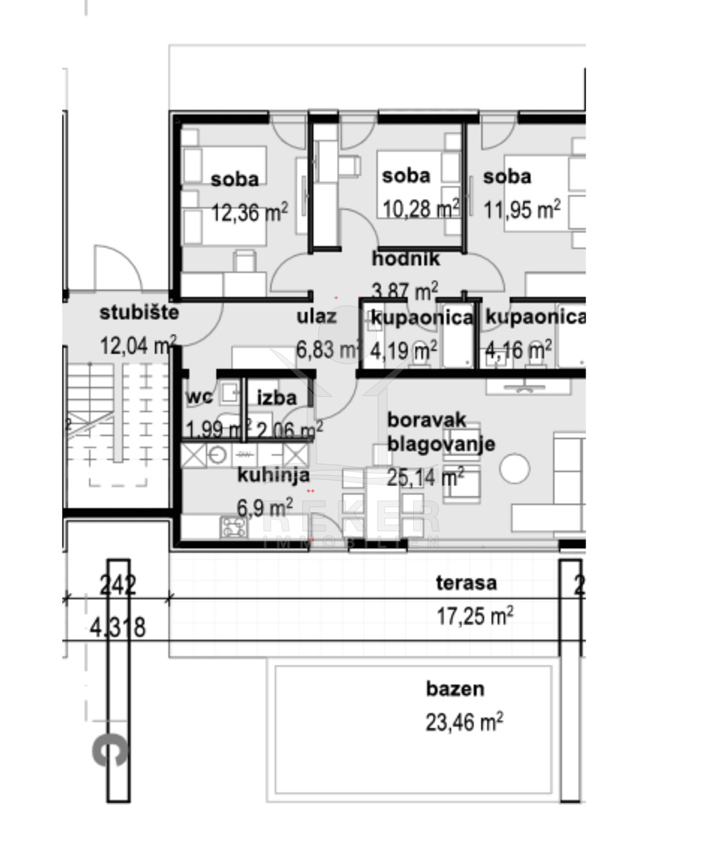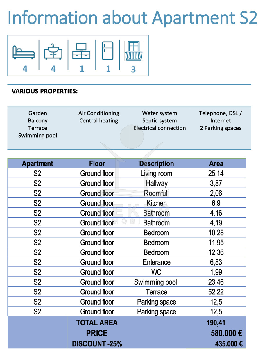 Das Apartment im Erdgeschoss bietet ein unvergleichliches Wohnerlebnis mit einem privaten Garten von 34,97 m² und einem exquisiten Swimmingpool von 23,46 m² für ultimative Entspannung. Das Neubaugebäude besteht aus nur sechs hochwertig ausgestatteten Wohneinheiten, die mit den besten Materialien namhafter Hersteller erbaut wurden. Geplant ist der Abschluss aller Arbeiten für den 1. Juli 2024. Die Dreifachverglasung, Sicherheitstüren, Parkettboden und Aluminium-Außenschreinerei tragen zu einem anspruchsvollen Wohnambiente bei. Zwei Außenparkplätze jeweils mit 12,50 m² sorgen für bequemes Parken und runden das exklusive Angebot ab.