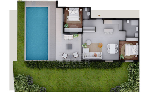 Der Außenbereich ist das Highlight dieser Einheit. Die 12,81 m² große Südterrasse mit Meerblick führt in den 28,89 m² großen Garten und weiter zum 36 m² großen Privatpool. Dank der südlichen Ausrichtung genießen Sie Sonne bis in den Abend. Ein Platz, um zu entspannen und den Blick über das Meer schweifen zu lassen.
