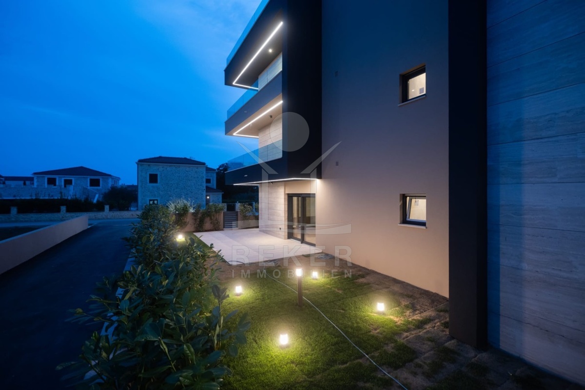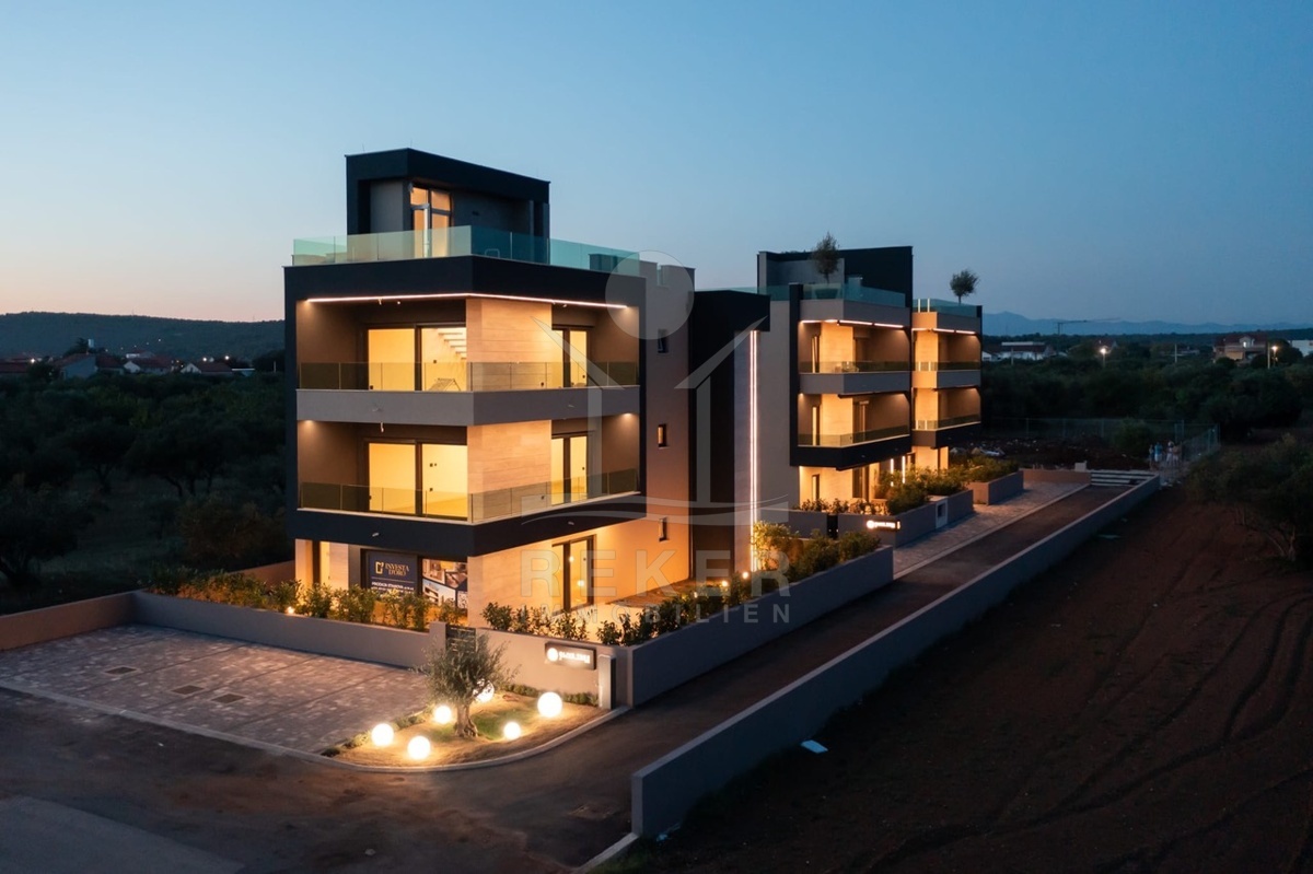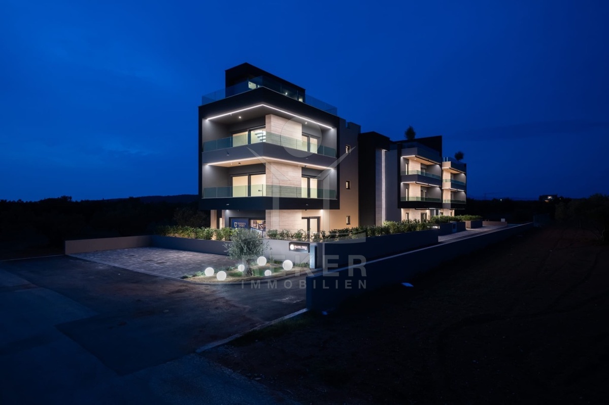 Im ruhigen, grünen Teil von Sukošan entsteht ein exklusives Wohnprojekt mit nur drei Wohnungen. Jede umfasst eine komplette Etage: Erdgeschoss, erstes und zweites Obergeschoss, dazu eine private Dachterrasse. Die Umgebung zeigt mediterranen Charakter: alte Olivenbäume, duftende Kräuter, weite Blicke. Nur 400 Meter trennen Sie vom Meer. Sonne, Ruhe und Meerblick in südlicher Ausrichtung machen diesen Ort besonders.
