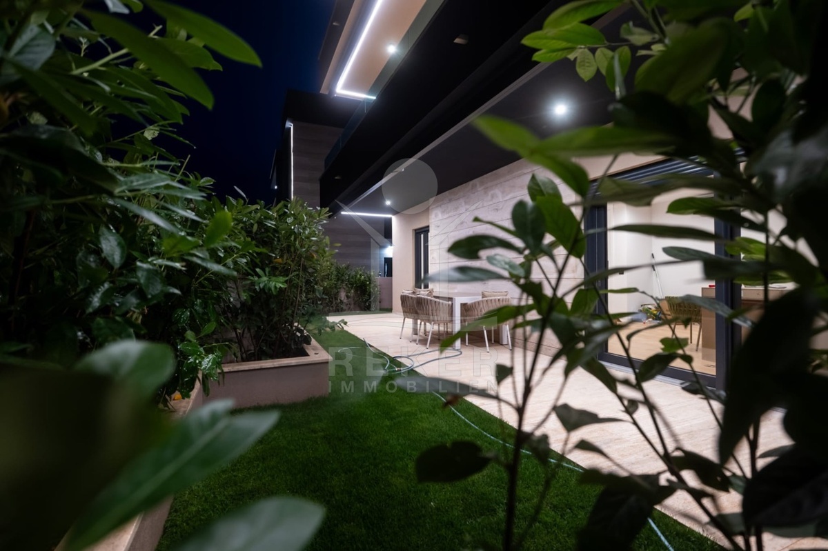 Diese Wohnung vereint Ruhe, Sonne und Meerblick auf ganz besondere Weise. Im Erdgeschoss gelegen, öffnet sie sich mit großen Glasschiebetüren zu einer überdachten Terrasse und einem privaten Garten. Ein Ort, an dem das Leben draußen weitergeht. Die südliche Ausrichtung bringt Licht von morgens bis abends, die mediterrane Umgebung sorgt für eine entspannte Atmosphäre.