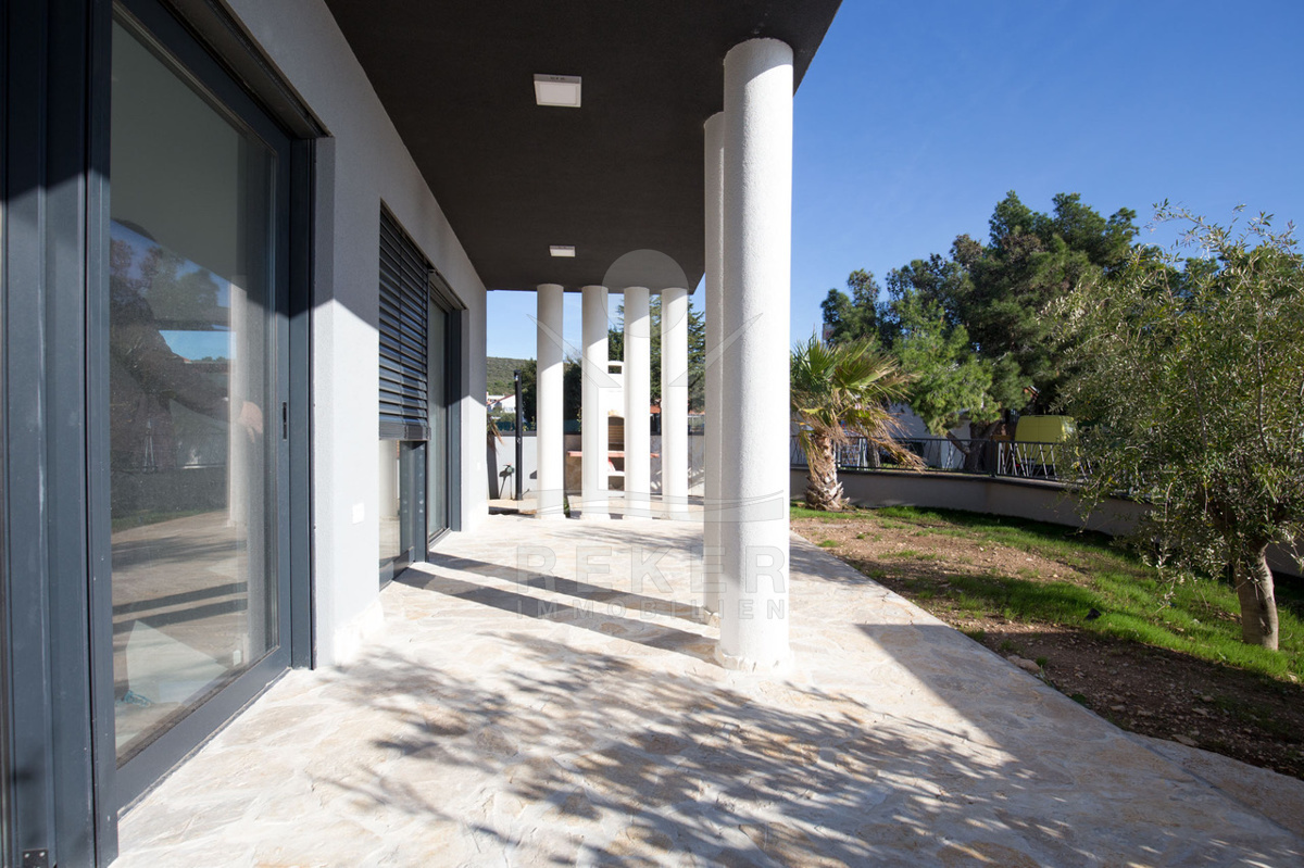 Die Außenanlage der Erdgeschosswohnung lädt mit ihrem überdachten Bereich zum Verweilen im Freien ein. Das Apartment verfügt über einen kleinen Garten mit gepflanzten Zitrusfrüchten, Olivenbäumen und Palmen. Die Solardusche ist exklusiv für die Wohnung im Erdgeschoss reserviert. Hier können Sie den atemberaubenden Blick auf das Meer genießen und gesellige Barbecues veranstalten. Die Kombination aus Natur und Meer sorgt für eine entspannende und idyllische Atmosphäre. Die Wohnung bietet außerdem eine eigene Garage sowie einen Stellplatz im Freien, sodass Ihnen ausreichend Parkmöglichkeiten zur Verfügung stehen.